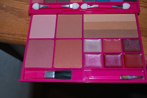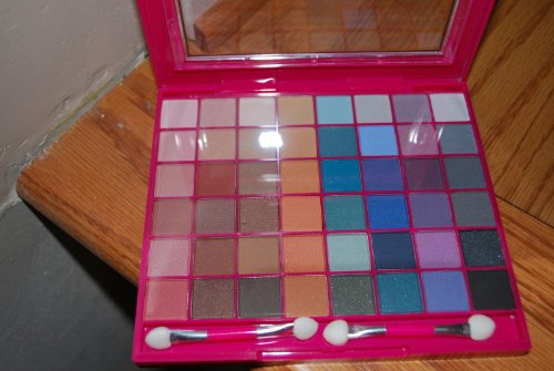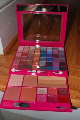 -. Feature : FOLD OUT DOUBLE TRAY MAKEUP PALETTE / 48 EYESHADOWS + 2 SPONGE APPLICATORS / 4 BLUSH PLUS 1 SHIMMER POWDER + 1 BLUSH BRUSH / 6 LIP GLOSS + 1 LIP BRUSH / 3.48oz TOTAL NET WT