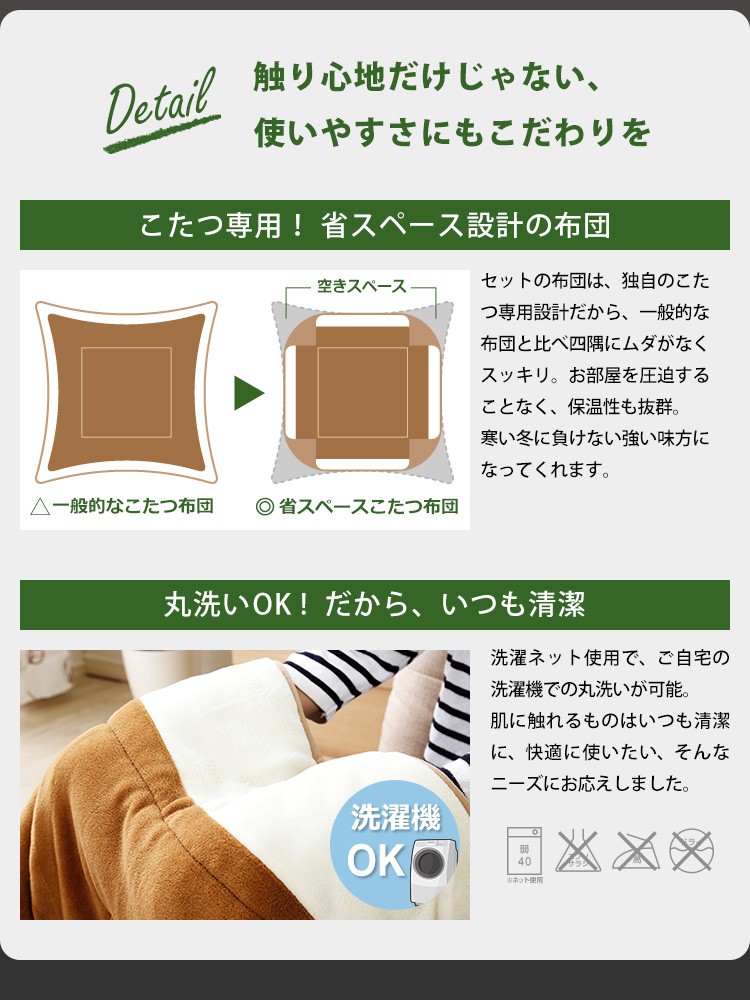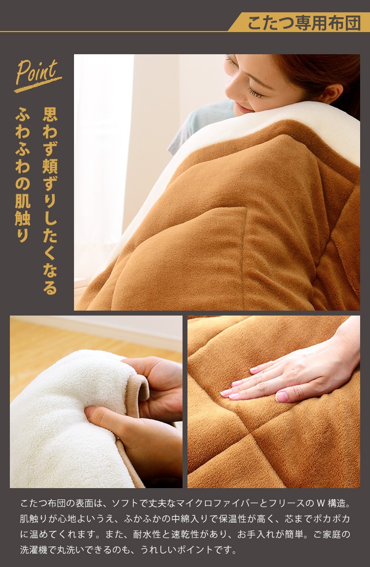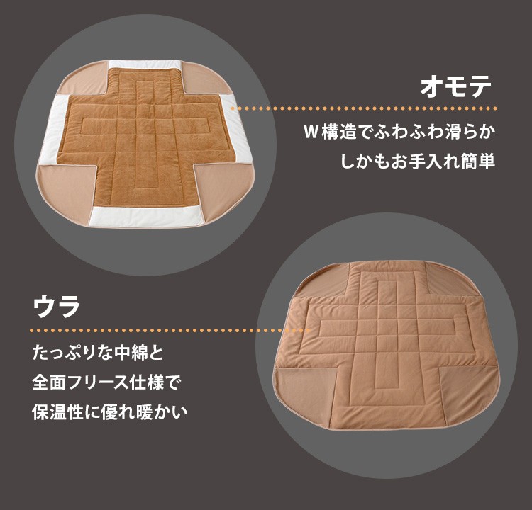 こたつ布団:側生地:表地、裏地・コーナー部:ポリエステル100% 詰め綿:ポリエステル100%(重量118g)