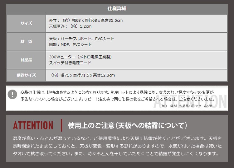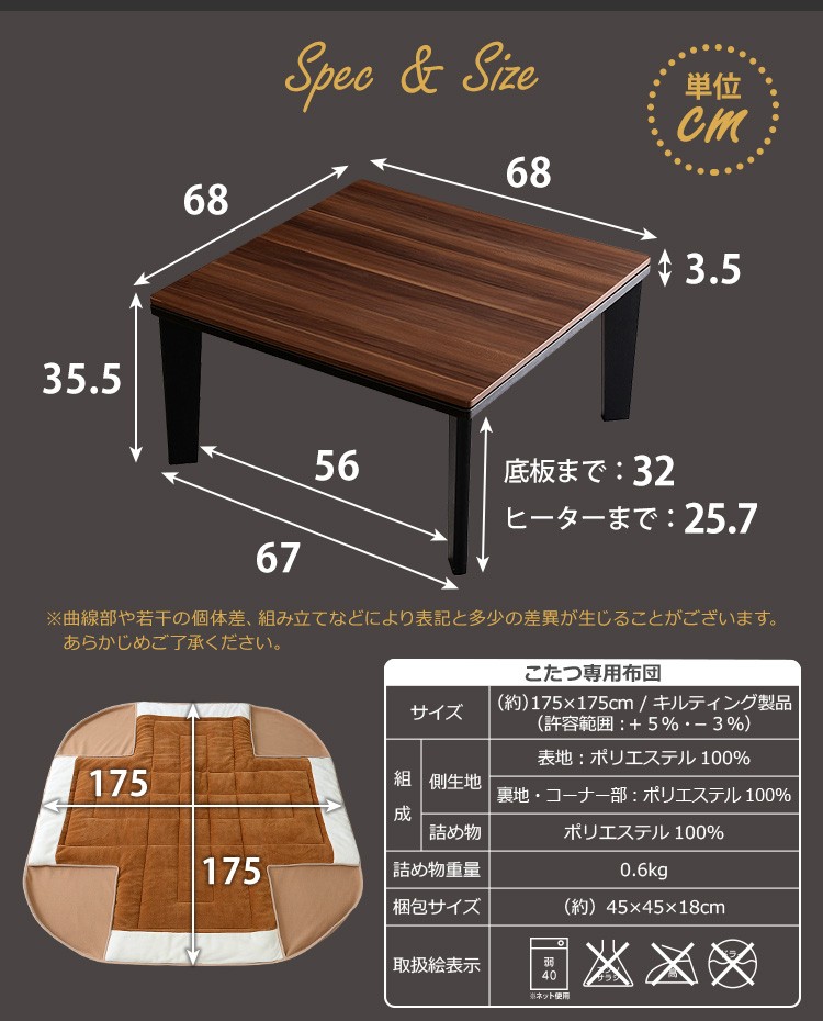 こたつ本体:68x68x35.5cm こたつ布団:175×175cm(許容範囲+5%・-3%)