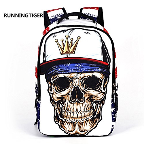 -. Feature : [Basic Parameters] Material: polyester,Size:18.9"*12.2"*5.9" ,Capacity: 22L / [Fashion P.R.Inting Students Bags]: 3D Skeleton Skull King pattern with American Flags element,cool and stylish.Perfect for teenagers, espeiclaly who love Hip-hop,music ,art etc tendency fans / [Comfortable] Ultra Lightweight for daily carrying.Ergonomic padded back panels and adjustable, fully padded shoulder straps offer cushioned comfort / [User-friendly Design, Easy to Store Objects ] 2 * zipper outer bag + 2 * side pocket + 1 * zipper camera bag + 1 * (28cm) laptop sandwich / [Big Capacity Backpack] Suitable for 14" laptop, iPad, A4 Books.Multifunctional Backpack,Not only a school packpack,perfect for campus,traveling,gathering,cycling and shopping