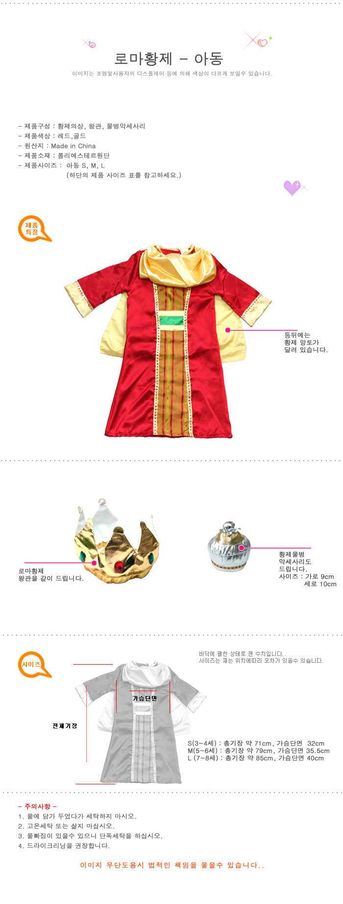 의상의 택(tag) 또는 장신구 및 소도구가 있는 경우에 때어 버리시면 사용하신 것으로 간주하며 반품 및 교환 안됩니다.사이즈를 꼭 확인 하시고 구매하시기 바랍니다.사이즈 오차로 인한 교환은 왕복 택배비 본인 부담입니다.