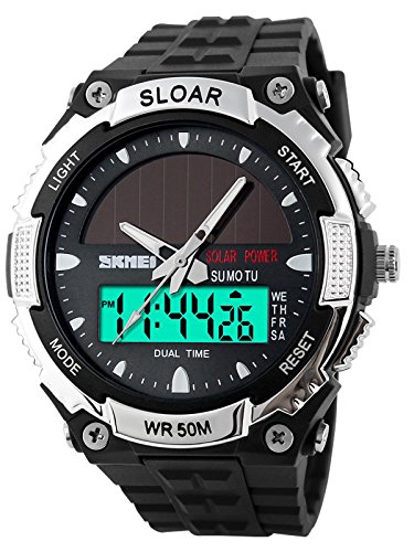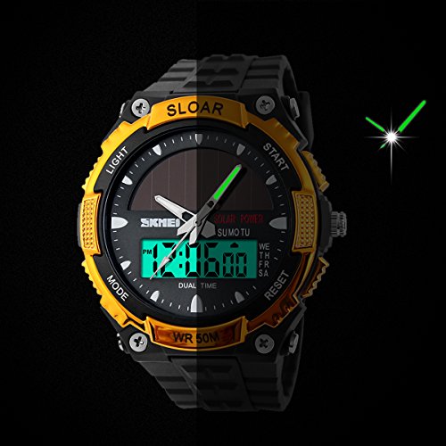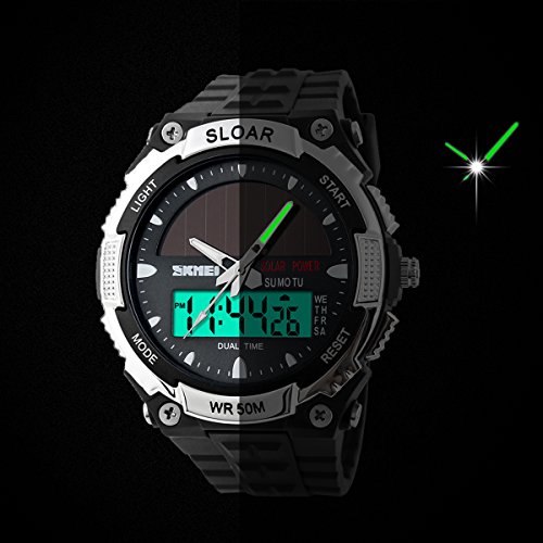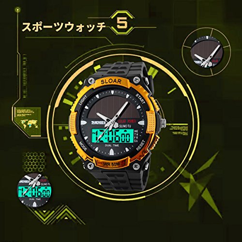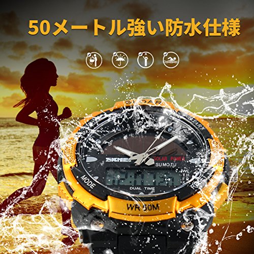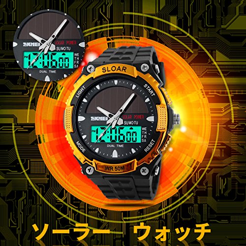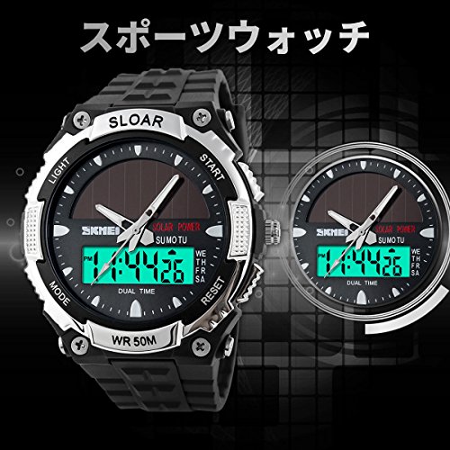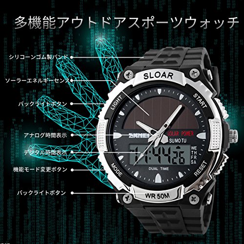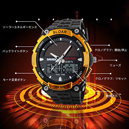 -. Feature : 防水機能:50メートル防水できます。日常生活ほとんどの場面に対応できます。シャワー、水泳も気軽くに対応します。 / 本体直径:44mm  ケース厚み:15mm バンド長さ:150~220mm / ケース材質:プラスチック バンド材質:ABSプラスチックセメント 風防素材:高透明度樹脂ガラス 精度の高い日本製クオーツムーブメント / 様々な機能があり、コスパーが高いのスポーツスタイル腕時計です。アウトドアやトレーニングに向きます。プレゼントとしても良い選択です。 / クロノグラフ機能:ランニング、レーニング、アウトドアスポーツ、登山などの場合によく活用できます。 バックライトが付いております。暗い環境に居ても時間を見やすい。 アラームを設定できます。カレンダー機能付き:日付、曜日表示。 ソーラーエネルギー:光がある時に太陽エネルギーで稼働して、暗い環境に居ると腕時計自身の電池で稼働します。 二つの時間表示:デジタルとアナログ二つの時間を設定、表示できます。