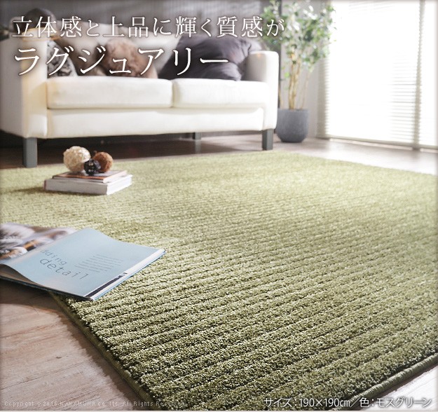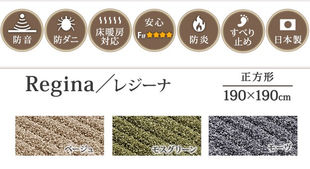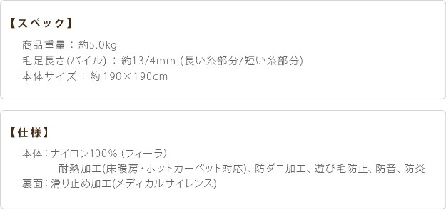 ※メーカー直送のため代金引換はお受けできません。※沖縄・一部離島は別途送料がかかります。お見積もりいたしますのでお問い合わせ下さい。【カラーバリエーション】ベージュ・モスグリーン・モーヴ【仕様】本体:ナイロン100%裏面:滑り止め加工【サイズ】本体:約190x190cm毛足長さ(パイル):約13/4mm重量:約5kg株式会社ナカムラ(33100226)