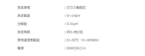 | 付属品 | pH電極、電池、取扱説明書、pH7基準液(50ml)、保証書(1年) |