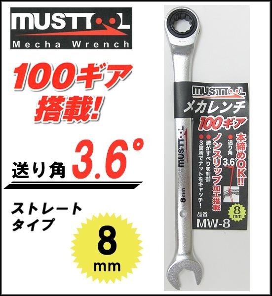 | 仕様 | ■サイズ:8mm ■ストレートタイプ 【ギアレンチ部】 ■100ギア ■送り角:3.6度 ■本締め可 ■トルク値:34.5N.M 【スパナ部】 ■ノンスリップ加工 ■滑り止め加工(溝) ■トルク値:13.3N.M |