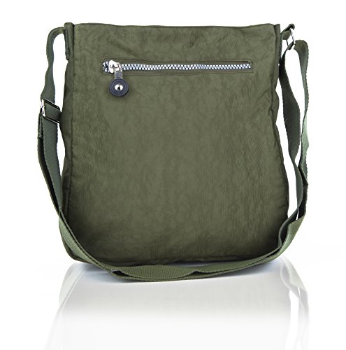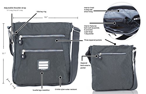-. Feature : The Suvelle Go- Anywhere crossbody bag is stylish and accommodates everything you need for an all-day outing: those always on the go, or while shopping, traveling, weekends, running errands, everyday use and diaper bag for parents on the go, this is the bag you'll want by your side wherever you go!!! / Made of practical water resistant and stain resistant crinkle nylon fabric that is durable lightweight and of high quality construction, easy to care for wipe clean or machine wash, Suvelle logo medallion at the front offers a subtle touch of brand identification / 3 spacious zippered compartments lined in easy-see silver lining helps find items quickly and offers plenty of storage to fit a tablet/iPad and your daily essentials while you're on the go, one back exterior zippered pocket is ideal to hold frequently used items such as cell phone, wallet, sunglasses and more The side exterior of the bag includes a key loop to have your keys handy / Top main compartment features: back wall zippered pocket for small loose items such as change, lip balm and more, 5 card slots fits your credit cards, business cards, rewards cards, 2 pen loops, and 1 multifunctional slip pocket ideal for cellphone and portable gadgets, it helps you keep everything separated and organized / Soft and durable shoulder strap with easy adjustments and no irritations allows the bag to be worn over the shoulder or across the body and at a variety of lengths. Strap measures: 53" L, shoulder drop: 26" L Bag measures: Approximately 10" W, 11" L, 2" D