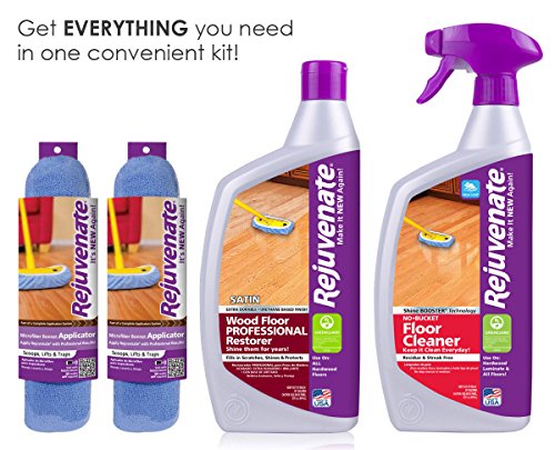 -. Feature : Everything needed to completely clean, restore, polish and shine your hardwood floors. / One Rejuvenate® Floor Cleaner for Hardwood, Laminate & All Floors - 32 oz. / One bottle satin finish Rejuvenate® Professional Wood Floor Restorer - 32 oz. / Two Rejuvenate® Microfiber Mop Bonnet Applicators
