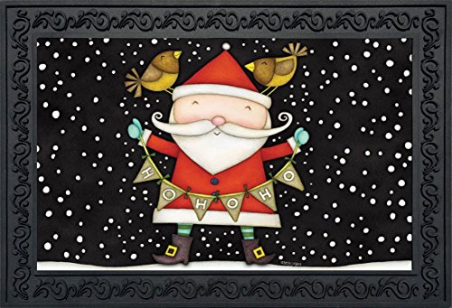 Cheerful Santa doormat is a festive holiday design focusing on Santa Claus holding a "HoHoHo" banner with two little birds perched on his hat. This cute primitive design is the perfect addition to the Christmas decor in a house with children. Printed on weather resistant polyester material with a nonskid rubber backing. Measures approximately 18" x 30". Can be used alone or in the Briarwood Lane Mat Tray (as shown, sold separately).