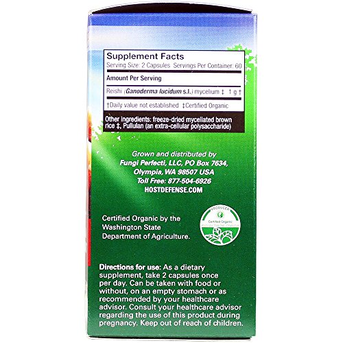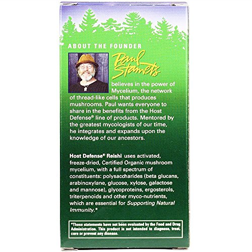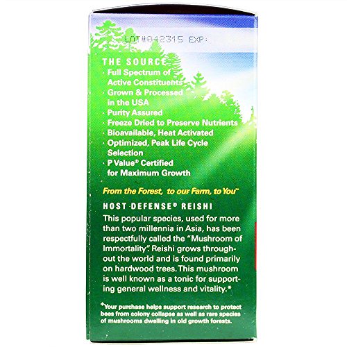 -. Feature : WELLNESS + VITALITY: Used for more than two millennia in Asia, Reishi has been respectfully called the "mushroom of immortality." Reishi grows throughout the world, P.R.Imarily on hardwood trees, and is well known for supporting general wellness and vitality. / 474 FREE: 474 is the current number of harmful pesticides tested for in the comprehensive quality analysis used at Host Defense. A longtime supporter of the Certified Organic movement, Host Defense has always P.R.Ioritized purity and safety of natural products. / FULL SPECTRUM: Host Defense Reishi uses activated, freeze-dried, Certified Organic mycelium, with a full spectrum of constituents: polysaccharides(beta glucans, arabinoxylane, glucose, xylose, galactose and mannose), glycoproteins, ergosterols, triterpenoids and other myco-nutrients, which are essential for supporting natural immunity. / 100% CERTIFIED ORGANIC: Host Defense is a Certified Organic food producer and processor. Our organic certificates are always available upon request. We are the best-documented and longest certified organic mushroom company in the U.S. / SUSTAINABLY CULTIVATED: When sourcing mushrooms from the P.R.Istine Olympic rainforest, our team leaves the habitat and original mushroom intact and undisturbed. Only a small sample is required and taken for growing in the laboratories at the farm. Host Defense methods protect the native habitat.