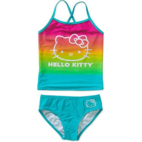 Your little one will love the way she looks while she's splashing around the pool or the beach with this comfy and fashion-forward girls' tankini featuring the lovable Hello Kitty. This swimsuit is made of a durable blend of polyester and spandex for a secure fit and has a soft lining for a smooth feel on her skin. There's a cute rainbow-colored Hello Kitty graphic on the front of the tank top, while the bottom has a hassle-free elastic waistband so it'll stay in place while she's romping around. The tank has a set of spaghetti straps for a comfortable fit. This officially licensed Hello Kitty tankini is available in Rainbow and was made for summer adventures. Hello Kitty Girls' Licensed Tankini: 80% polyester, 20% spandex Two-piece swimsuit Sublimated print on front with Hello Kitty logo and rainbow background Tank top with spaghetti straps Bottom with covered elastic waistband Officially licensed Hello Kitty productFeature