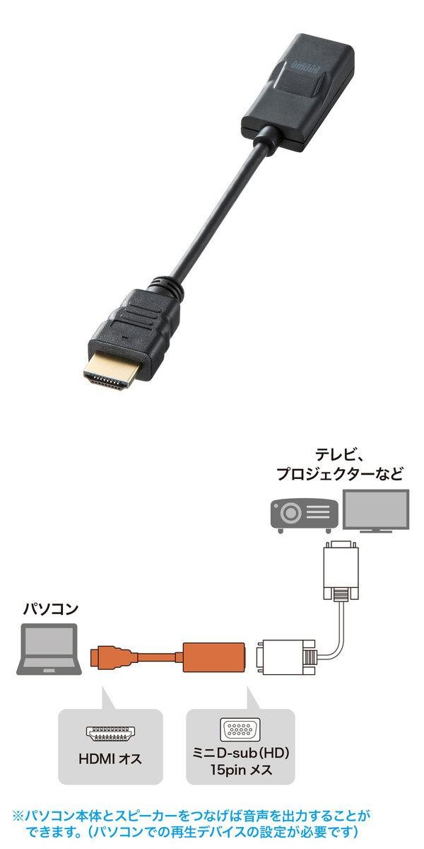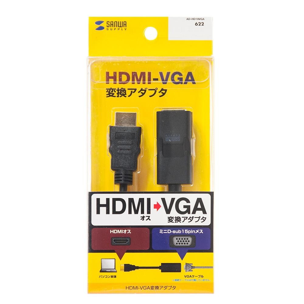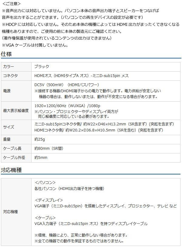 パソコンのHDMIポートからVGA(ミニD-sub15pin)端子のディスプレイやプロジェクターなどに画面を出力するときに使用する信号変換アダプタです。HDMI端子が無いプロジェクターなどに、HDMIケーブルがなくてもパソコンのHDMIポートから本製品、VGAケーブルで接続、画像や映像を出力することができます。ドライバなどをインストールする必要がなく、接続するだけで使用できます。 |