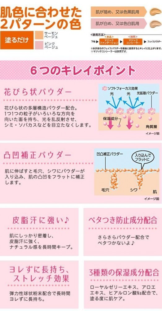 | お肌の気になるポイント(毛穴・シミ・小じわ)を隠す、お悩み解消ファンデーションです。花びら状の多構造パウダーを配合。1つ1つの粒子が光を乱反射させ、お肌の気になる悩みを隠します。肌色に合わせた2パターンの色からお選びください。別売りのマジックコンシーラーと合わせての使用がおすすめです! |