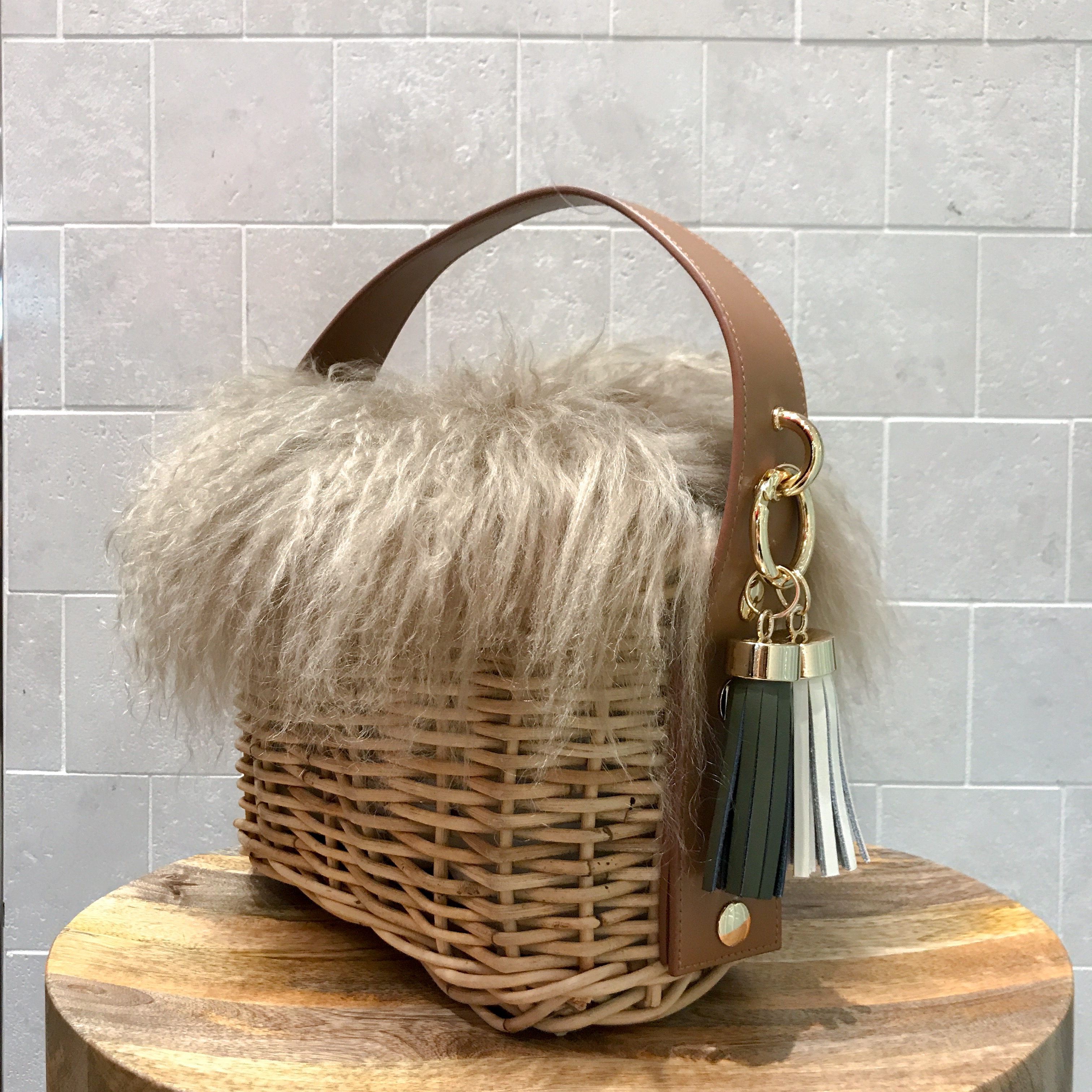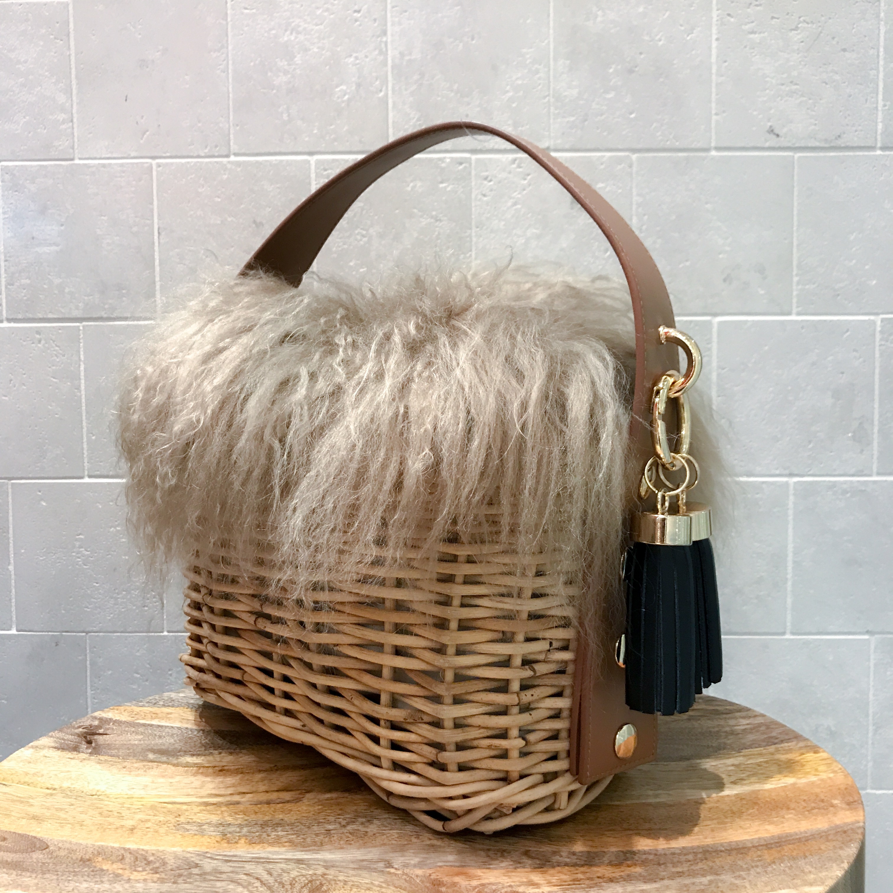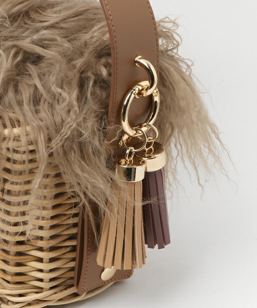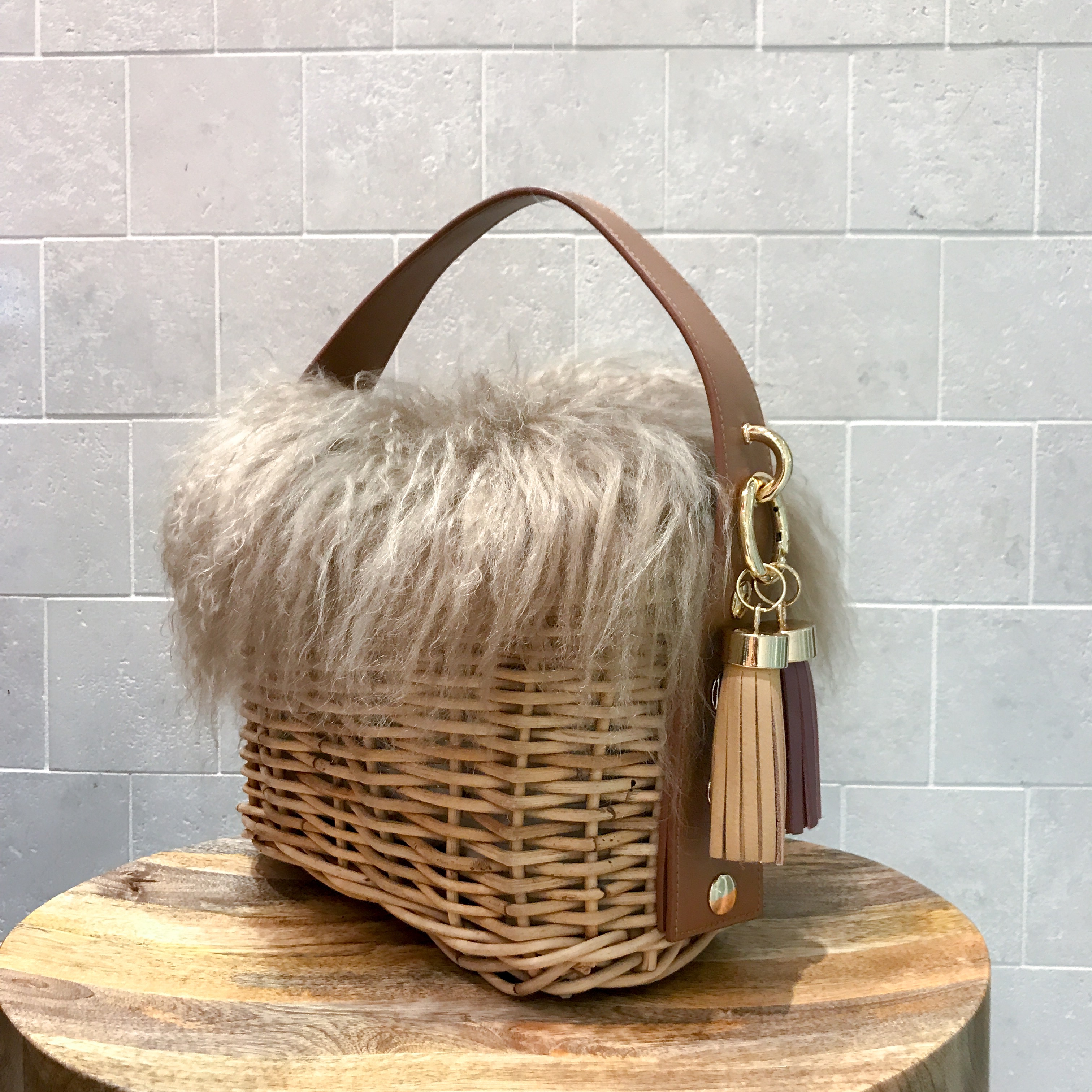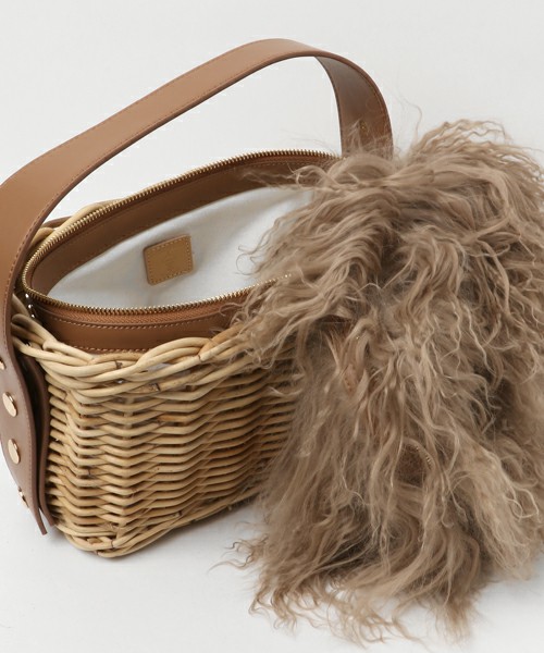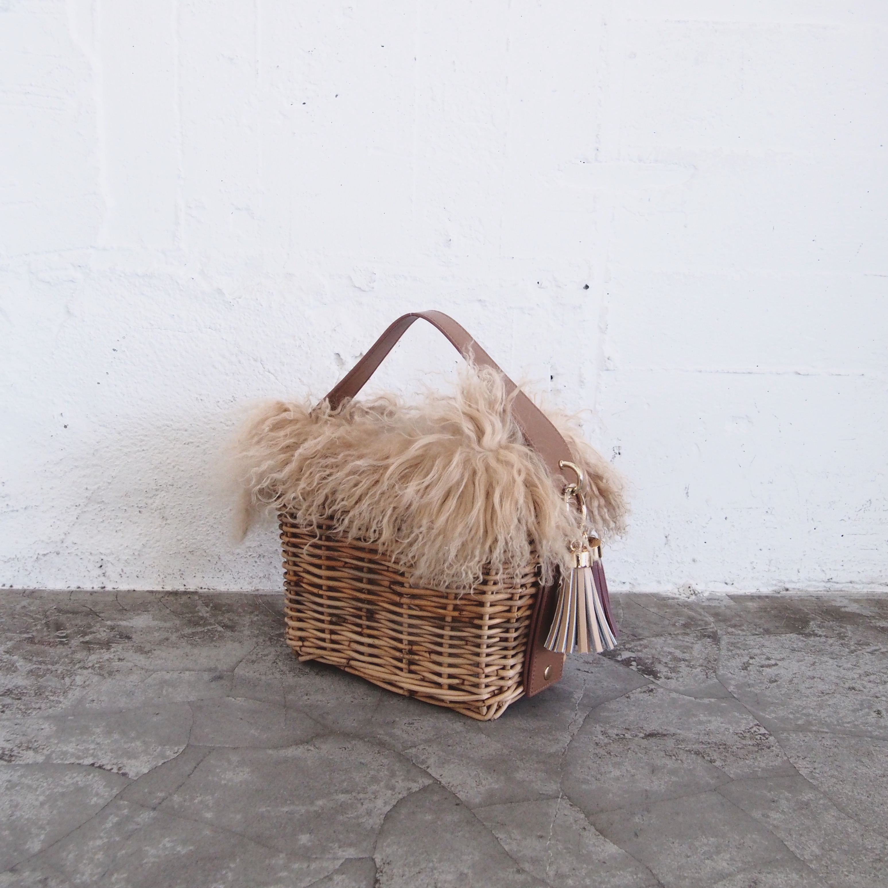【素材】カゴ部: 紅籘, レザー部: 牛革, ファー部: フォックスファー(グレー, バーガンディー), チベットラム(ブラウン, オリーブ)