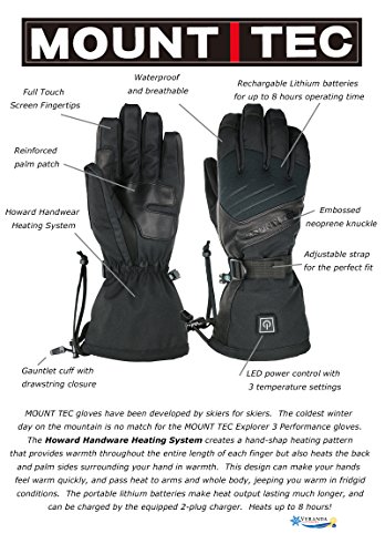 Specificity and Function Environmentally friendly far infrared micro composite fiber for Howard Handwear heating system Bending corrosion resistant, antistatic, washable Good heat conduction high conversion from electricity into warmth Durable waterproof softshell reinforced goatskin leather palm patch and trims 100g Primaloft ® silver insulation warm fever fabric for long-lasting warmth Touch screen compatibility on all 4 fingers and thumb (or full mitten fingertip area) Waterproof breathable insert with moisture-wicking brushed tricot Gauntlet cuff with drawstring closure cuff leash with barrel lock and end strap; LED-powered light with heat control 2 PCS portable 7.4V lithium batteries 1 PC double-plug charger.