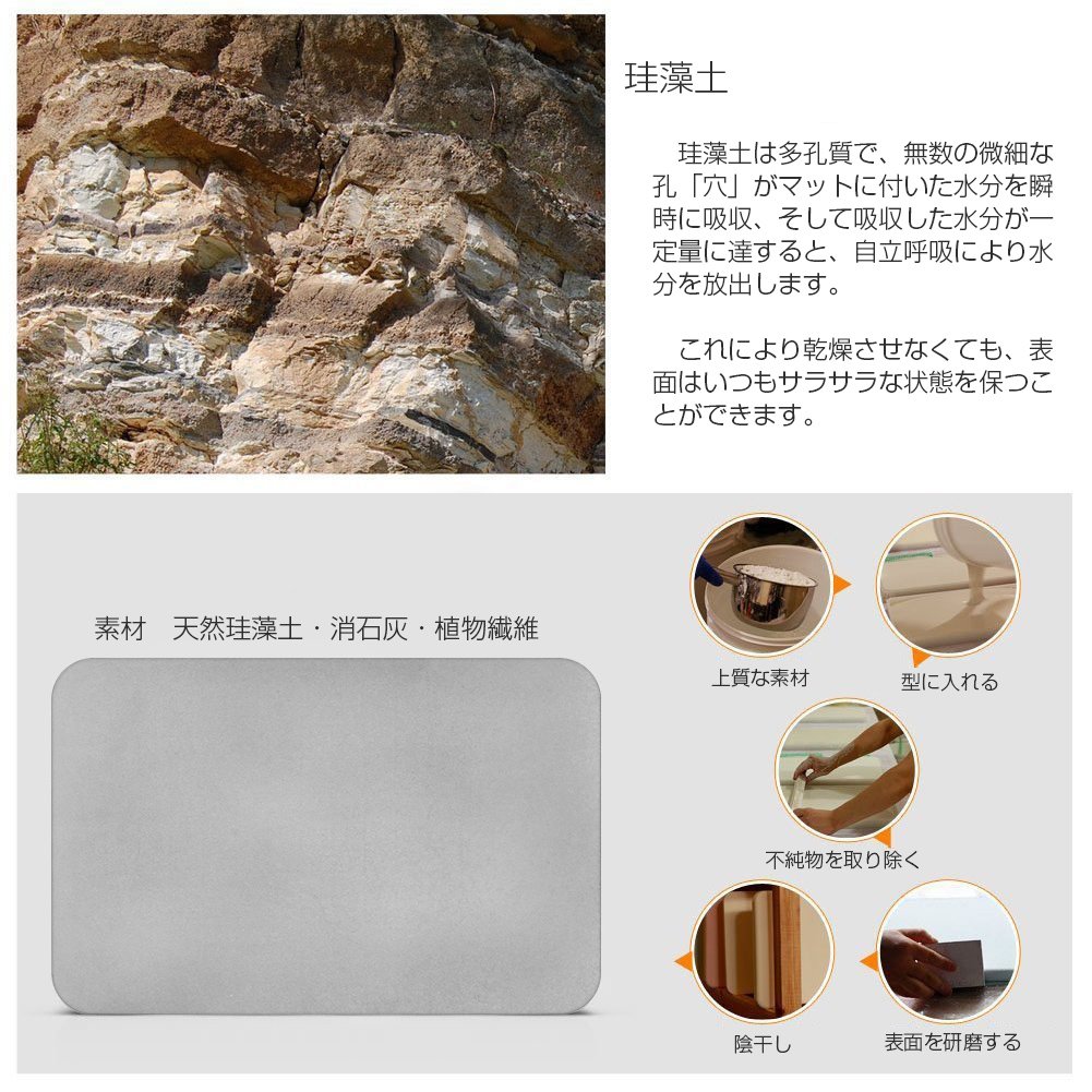 Diatomaceous earth absorbs the moisture attached to the mat instantaneously by numerous microscopic holes made of porous material, and when moisture absorbed reaches a certain amount, it releases moisture by autonomous breathing.