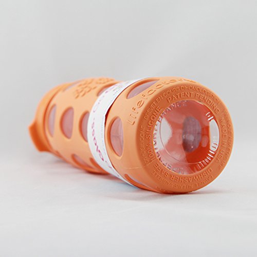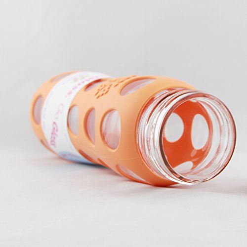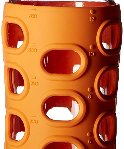 Glass beverage bottle with 22-ounce capacity protected by stylish silicone sleeve in orange
