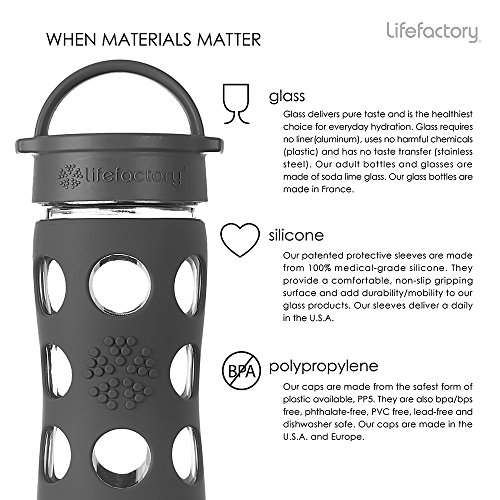 Glass bottle offers healthy everyday hydration and pure taste; bottle, cap, and sleeve are BPA/BPS free with no phthalates, PVC, or polycarbonates