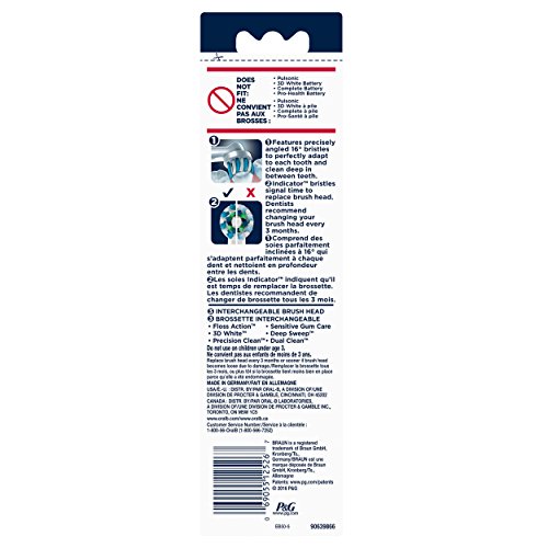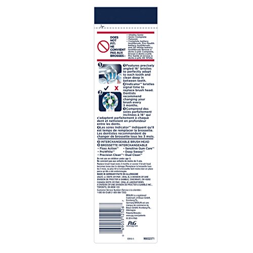 16 Degree angle cleans deep between teeth. The round head of the Oral-B Cross Action brush head is designed for a tooth-by-tooth clean, with specially engineered bristles for optimal tooth coverage. CrissCross bristles are set at a 16 degree angle to reach deep between teeth to lift and power away up to 100% more plaque for a superior clean vs. a regular manual toothbrush. Compatible with Oral-B Genius 8000, Oral-B PRO 7000, 6000, 5000, 3000 and 1000, and Oral-B Vitality. Each order comes with 5x Oral-B Cross Action Electric Replacement Toothbrush Heads.Feature