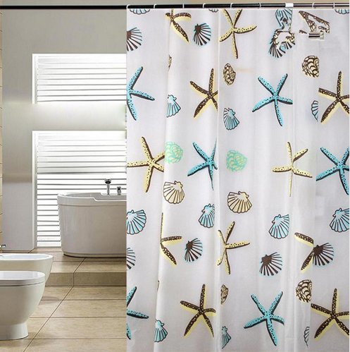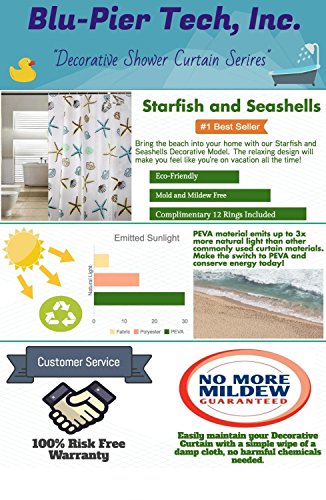 Blu-Pier Decorative PEVA Mildew Free Water Repellant Shower Curtain 72x72 Comes With 12 Hooks (Starfish and Sea Shells)
