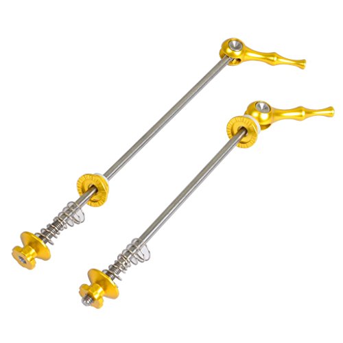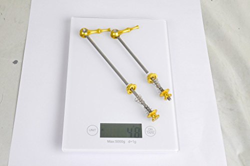 Product DescriptionDetails: Titanium Axle with two stainless steel springs Weight: 48g/pair Length: front 100mm, rear 135mm For Bike Type: Road Bike - Racing, Road Bike - Touring, MTB Color to choose: Gold, Silver, Red, Blue, Black0