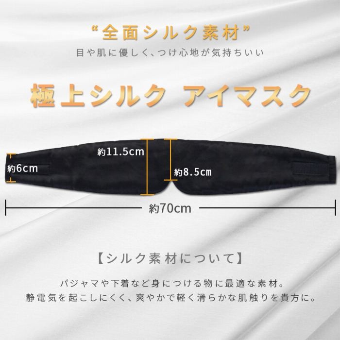 ■天然シルク素材■シルクは第二の肌と言われており、パジャマや下着など身につける物にも最適な素材。吸湿性・保湿性・放湿性に優れ、サラッとしているので、暑い日も爽やかな着け心地。■商品説明■●全面シルク素材で極上の着け心地を追求した天然シルクアイマスク●通常のアイマスクとは違い、耳まで覆ってくれて周囲の音を軽減し、良質な睡眠をサポート。●長時間着けても耳が痛くならず、目や肌にも優しい。●後ろは長さ約8.2cm、幅約2cmのマジックテープ固定なので、着脱や調整も楽々。【※ご注意】※紫外線から素肌を守ってくれる反面、シルク自体が紫外線を吸収する為、長時間直射日光にあてたり日光干しをすると変色する場合があります。■サイズ■縦 : 約11.5cm(目に当たる部分の一番広い箇所) / 約8.5cm(鼻の部分) / 約6cm(端)横 : 約70cm頭囲目安(マジックテープを2cm重ねた場合) : 最小約55cm / 最大約62cm【 発送について 】ご入金確認後1~3営業日以内に「ゆうメール」もしくは「ヤマトメール便」でお送り致します。※日曜・祝日の発送は行っておりません。発送後2~5日営業日で商品到着予定となります。