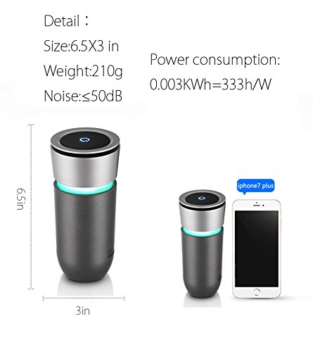 - Easy to Install : Plug the device into the car cigarette lighter or adaptor, with USB cable. Also could be connected with computer or the charger. Easy to change the filter net. Mini and Portable Design (6.5 x 3 inch), Light weigh (7.5 ounces).