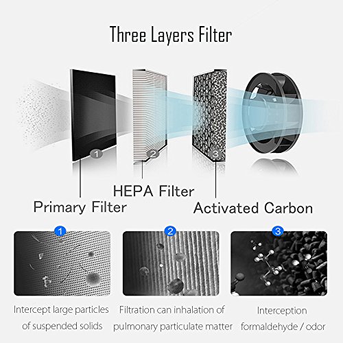 - 3 Filtration Stages : Ideal for people who suffer from allergies, nasal stuffiness,cough,sneezing,asthma,etc;Primary Filter + HEPA Filter + Activated Carbon reduce 99.9% of Allergens,Dust,Pollen,Smoke,Odors,Pet Dander,Formaldehyde,Mold spores and TVOC.