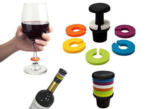 -. Feature : 6 drink glass markers / Bottle stopper / White, purple, blue, green, yellow, orange / Ideal for dinner/cocktail parties / Adaptable to fit most wine glasses