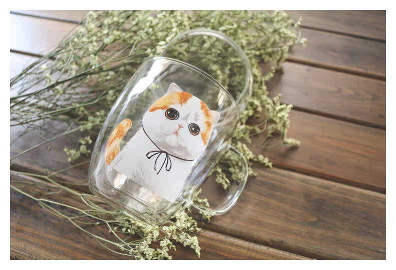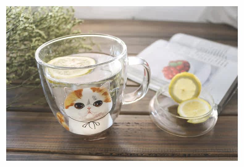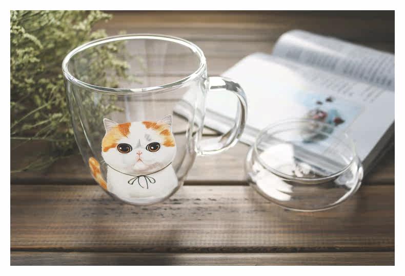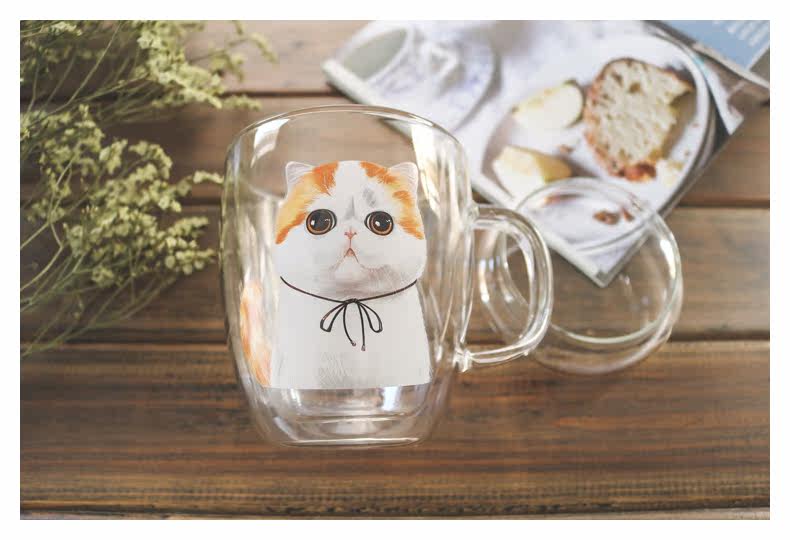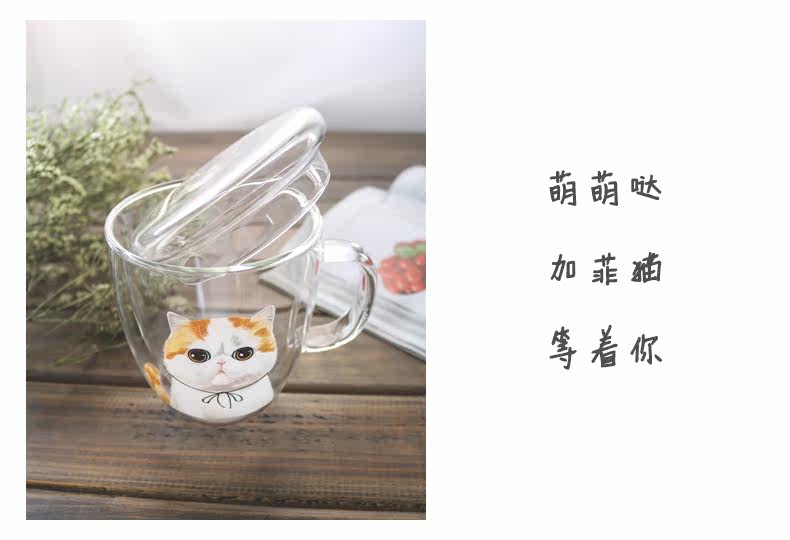 新品带盖玻璃咖啡杯加菲猫系列双层隔热牛奶杯可爱透明水杯猫咪杯