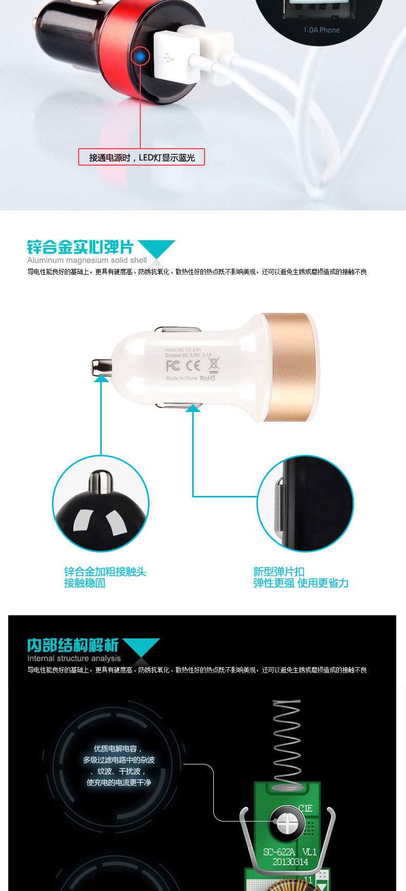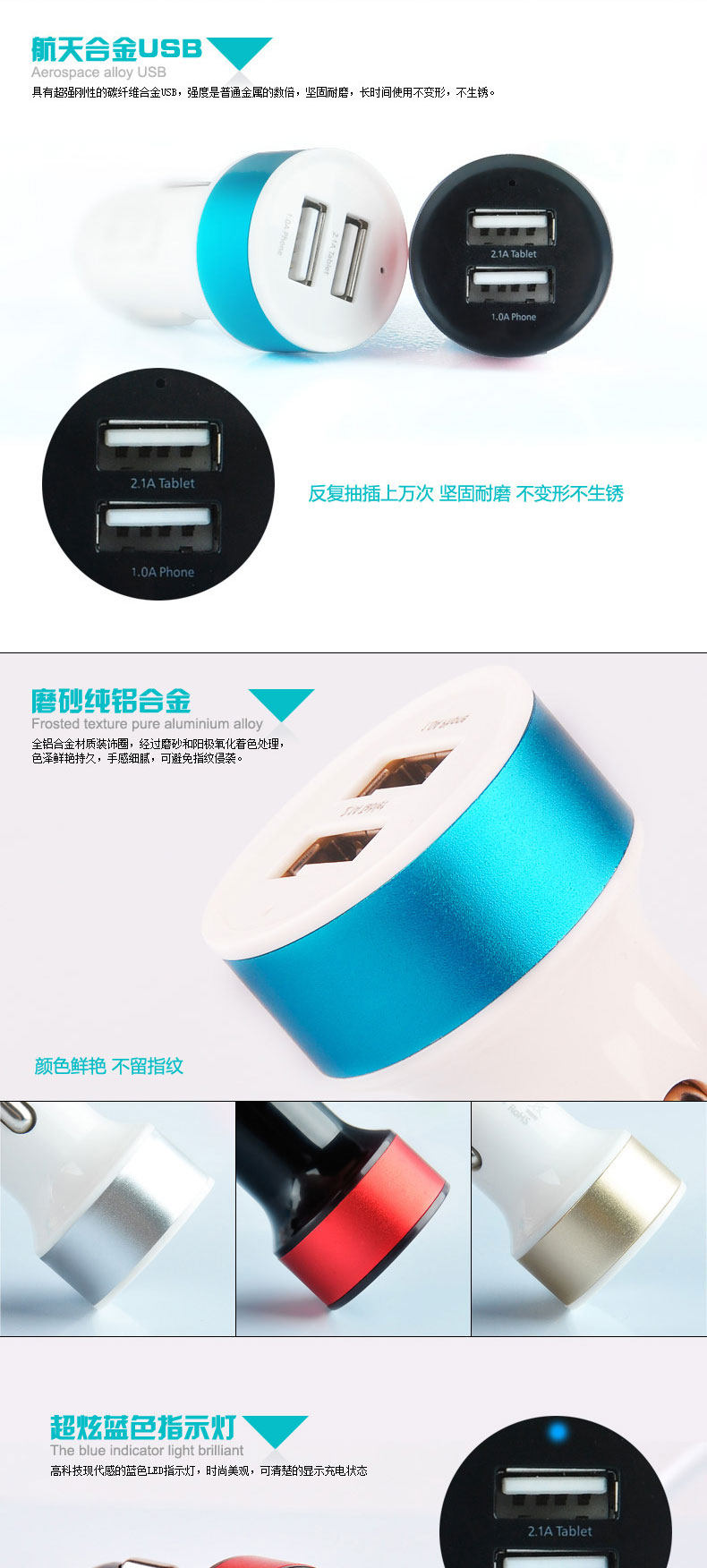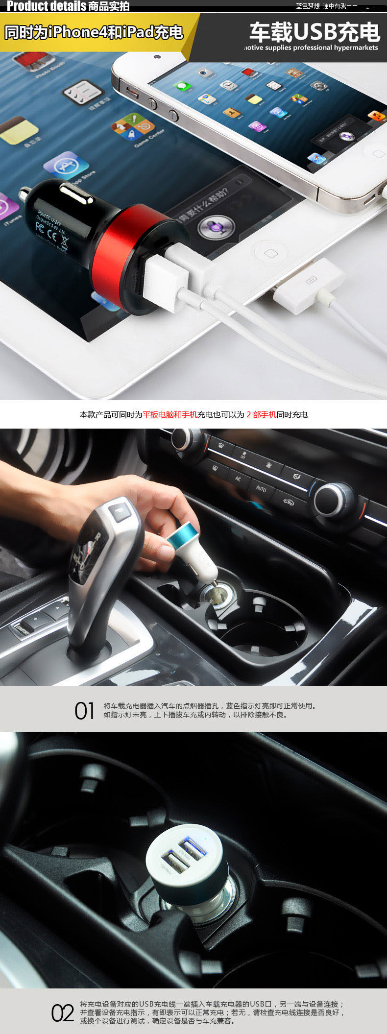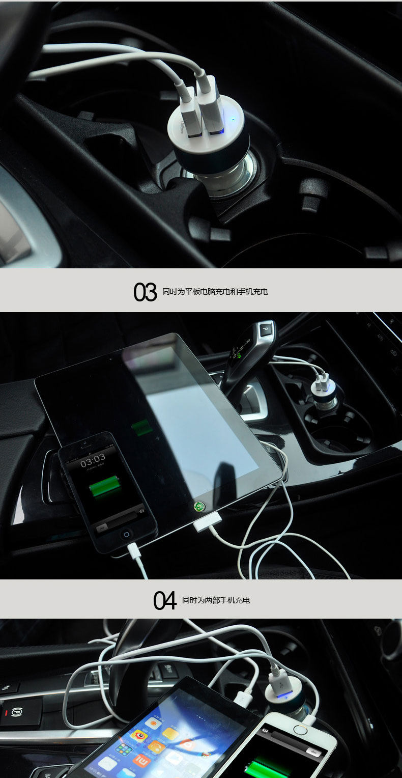 4. different USB port, different currents: 2.1A fast car charger, you can charge for ipad, but also for other electronic products charge