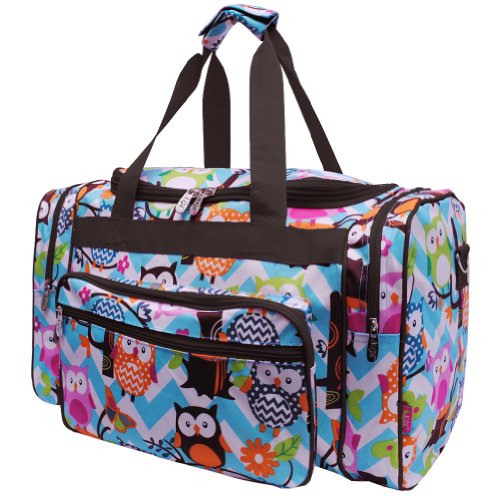 -. Binding : Apparel -. Brand : NGIL -. Department : womens -. Feature : Front zipper pockets / rubber feet on bottom / adjustable shoulder strap / Monogramable, However, WE DO NOT MONOGRAM! / side zipper pockets -. ProductGroup : Apparel -. ProductTypeName : BAG -. Size : Medium -. Title : Aqua & White Chevron Owl P.R.Int 20" Carry on Shoulder Duffle Bag
