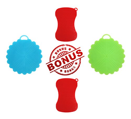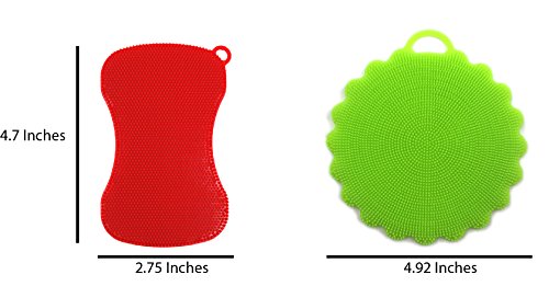 Package Includes 2 Red Silicone Scrubbers and 2 BONUS Flower Silicone Scrubbers with insulated design on one side.