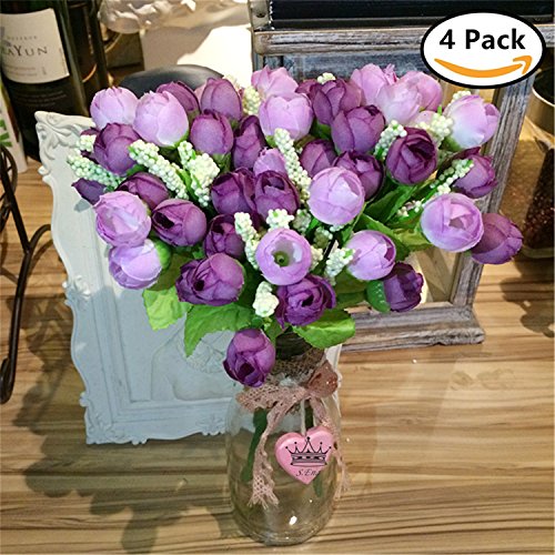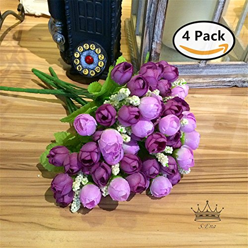 S.Ena, 5 Branch 15 Heads Artificial Silk Fake Flowers Leaf Finger Rose Wedding Floral Home Decor Bouquet Birthday Party DIY, Pack of 4 (Purple + Light Purple)