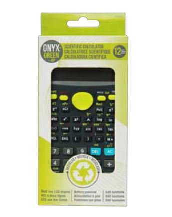 Onyx and Green Scientific Calculator has 240 basic and advanced functions with easy-to-read 2-line LCD display. Quality keypad - 47 precision-touch keys. Sliding protective hard cover for protection against dust and damage. Trigonometric functions sine, cosine and tangent (includes inverse), logarithmic functions, algebraic equation solver, statistical calculations with stat-data editor. Fraction calculations, full-function memory keys, battery powered, battery included, operating instructions enclosed. Body made from P.I recycled plastic, packing made from recycled carton box and soy-based ink. Portable and handheld size. ABOUT RECYCLED PRODUCTS: High percentage of post-consumer and post-industrial content in the product and packaging is the ultimate goal when we design and develop these products. In this Family, we introduce post-consumer recycled paper, recycled plastic, recycled rubber, recycled newspaper, recycled PET bottles and our latest additions, recycled milk cartons and recycled aluminum.Feature