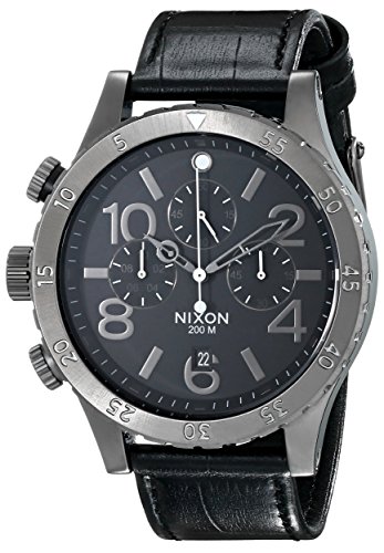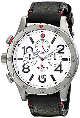Much like high-end German sports cars, the Nixon 48-20 Chrono Leather Watch is housed within a sleek and sophisticated housing, made of stainless steel for enhanced strength, corrosion resistance, and a solid overall feel. Taking bold design cues from racing instrumentation, this watch features go-fast styling for those with a taste for well-executed aesthetics. A leather strap adds a dignified look that's chock full of character. Japanese-made, six-hand quartz movement is accurate to 1/20th of a second, giving precise timekeeping for those on the go. A unidirectional, rotating bezel acts as a countdown timer, and three chronographs keep you on the ball and informed. Additional noteworthy features include 200 meter water-resistance, date indicator, and textured subdials.