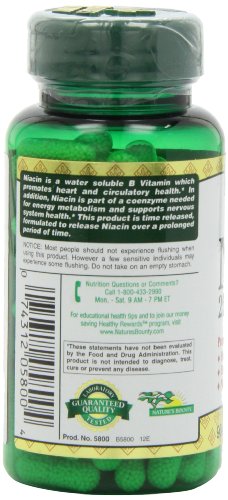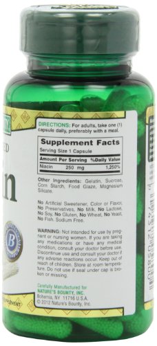 -. Binding : Health and Beauty -. Brand : Nature's Bounty -. Feature : Niacin helps maintain proper metabolic functioning, promotes carbohydrate metabolism, and supports healthy skin and hair* / These special time released capsules are designed to release Niacin into your system gradually, so you can continue to benefit throughout the day* / This product is not intended to diagnose, treat, cure or prevent any disease -. Label : Good n Natural -. Manufacturer : Good n Natural -. MPN : 5800 -. PartNumber : 5800 -. ProductGroup : Health and Beauty -. ProductTypeName : HEALTH_PERSONAL_CARE -. Publisher : Good n Natural -. Studio : Good n Natural -. Title : Nature's Bounty Time Released Niacin 250 Mg., 90 Capsules