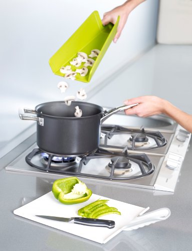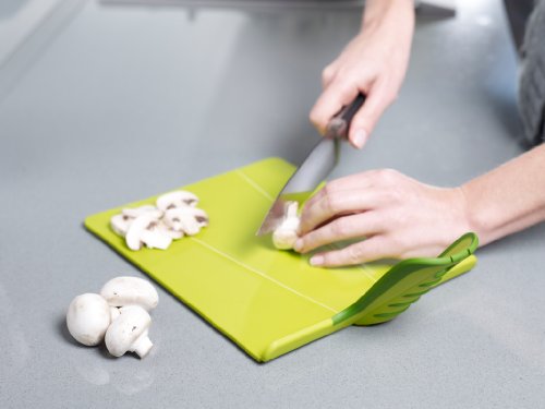 - Feature : Oversized, innovative folding chopping board by Joseph Joseph / Provides a durable, knife-friendly cutting surface for all types of food preparation / Polypropylene living hinges folds into a chute when the handle is squeezed to guide food into pot / Features non-slip feet and soft-grip handle / Measures 19 by 10-3/4 by 0-1/2-Inch; dishwasher safe