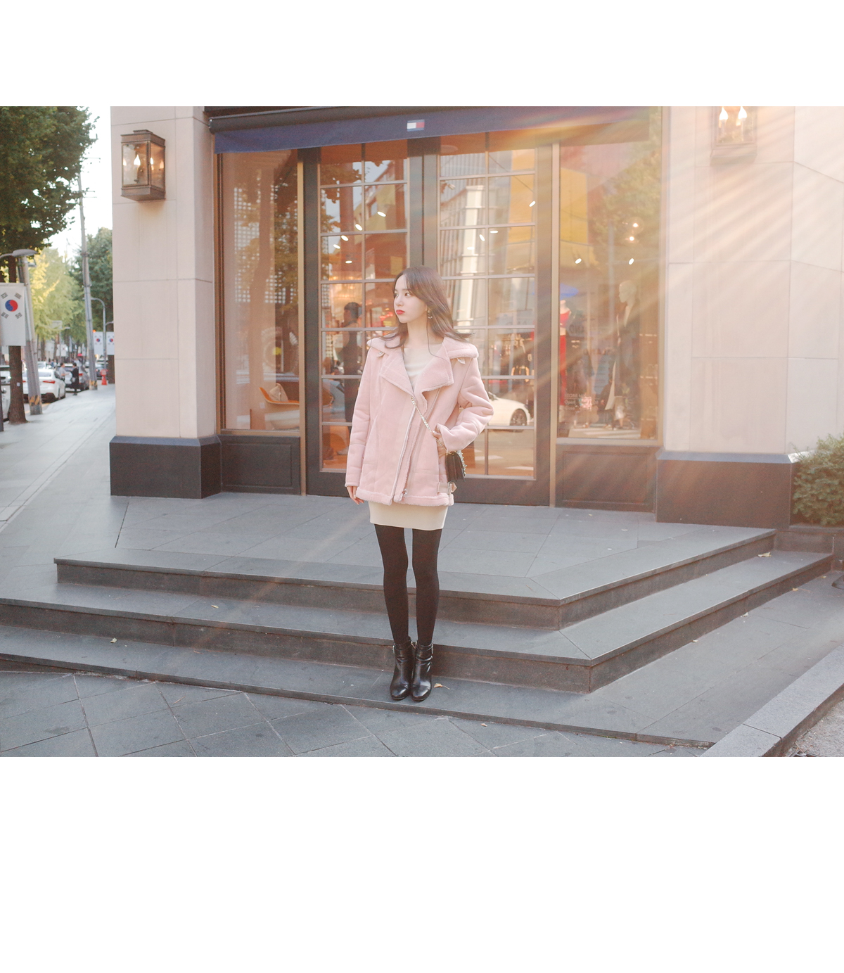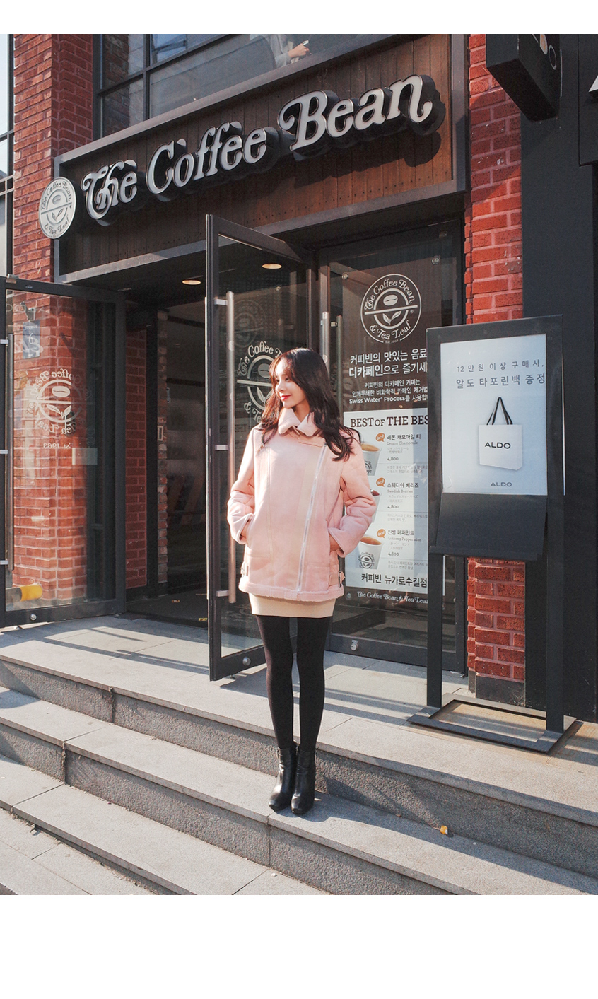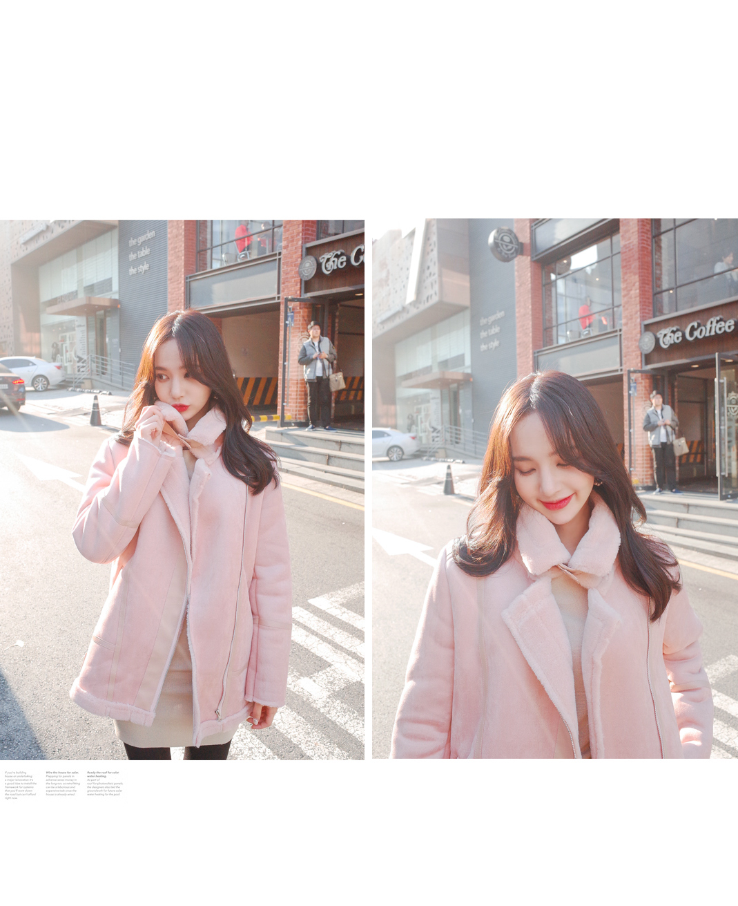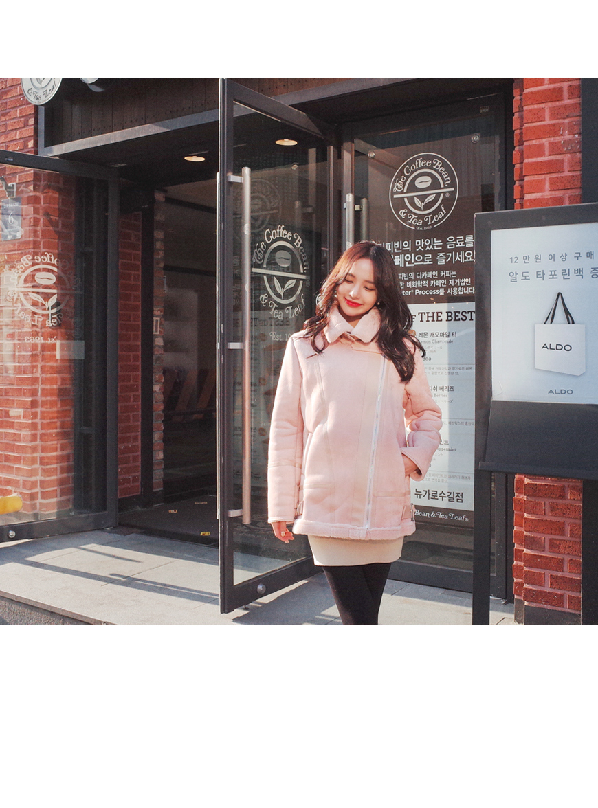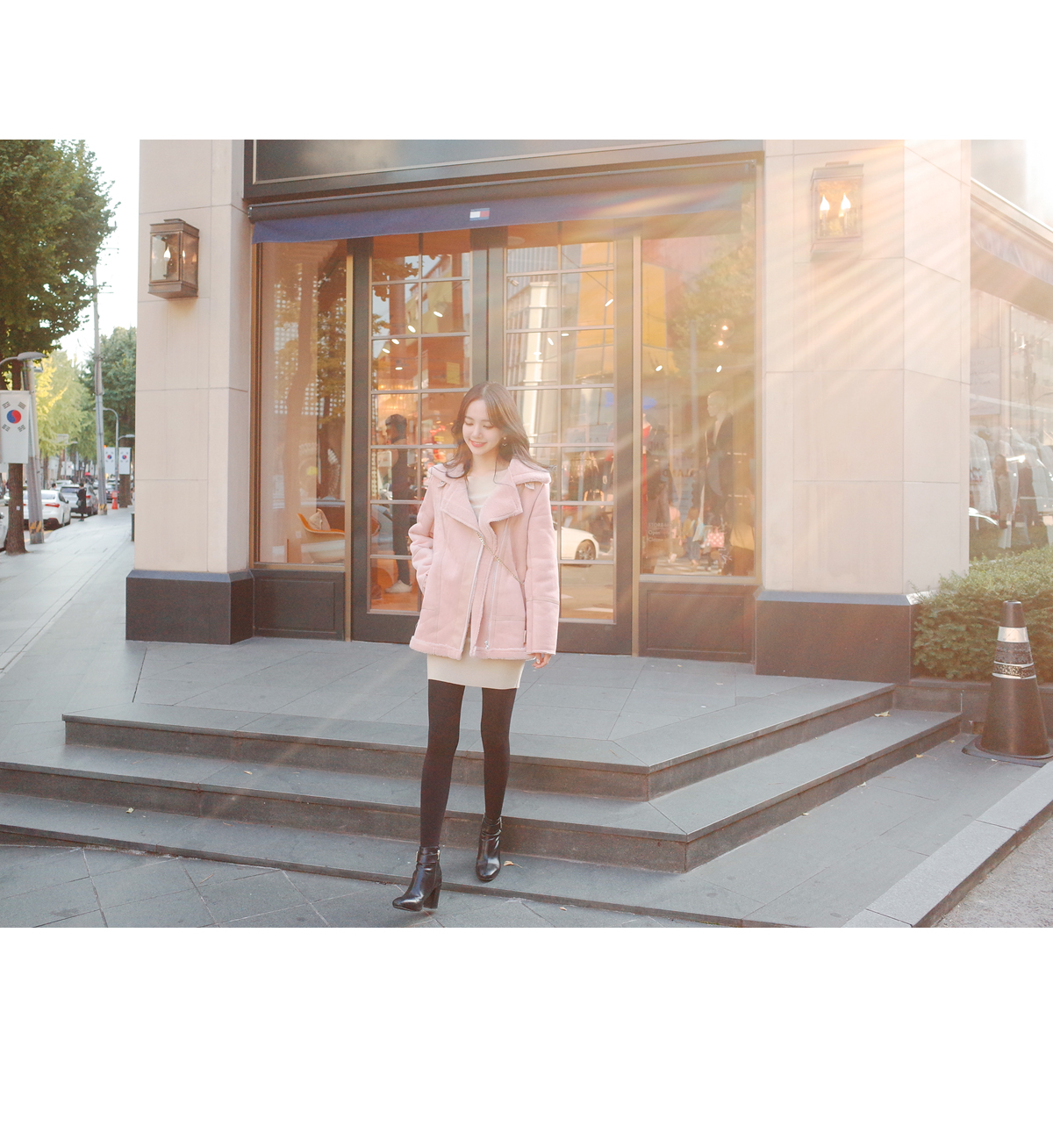 달달한 핑크컬러로 여성스러운 매력이 돋보이는 무스탕이에요