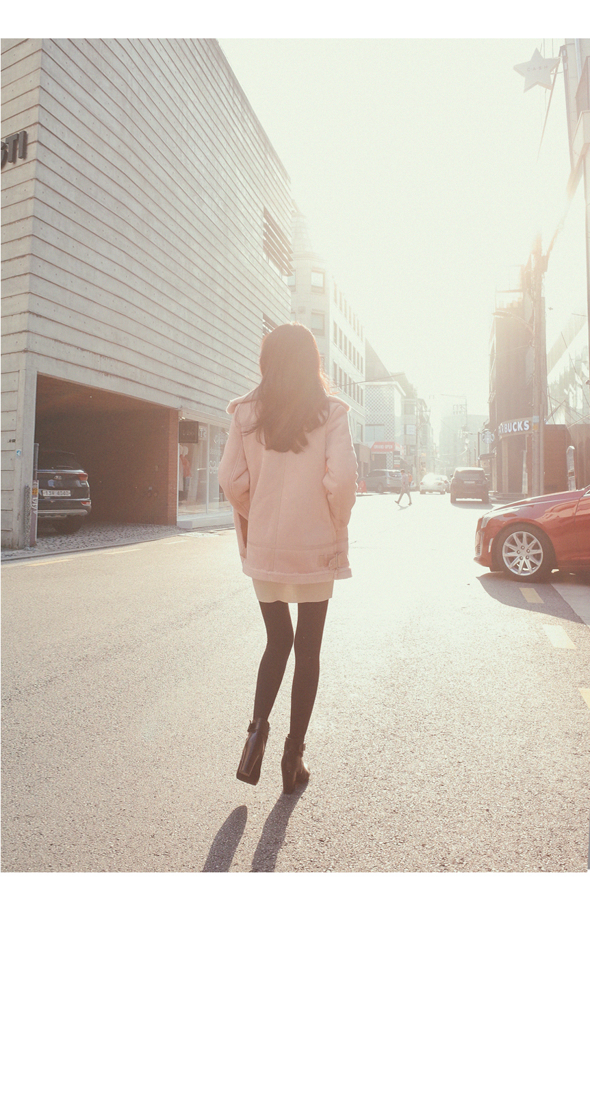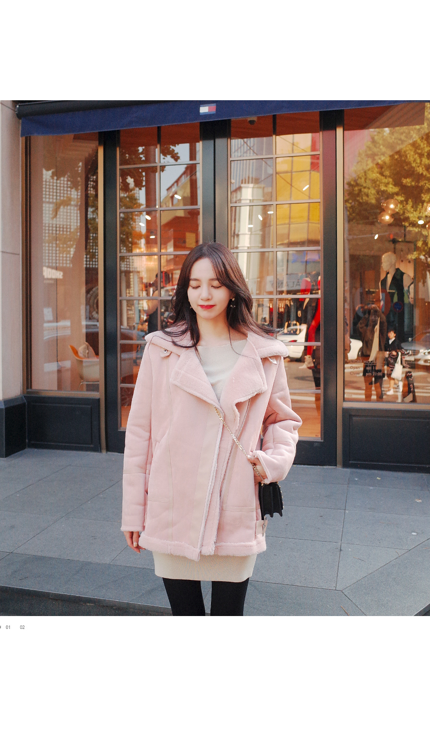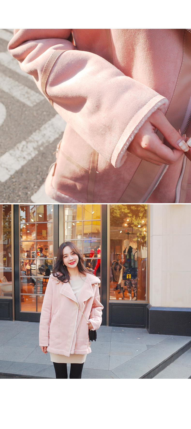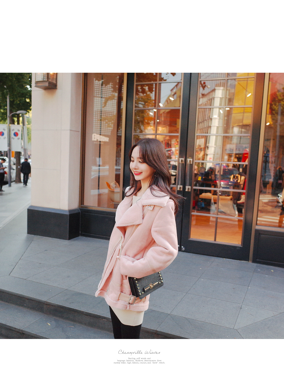 달달한 핑크컬러로 여성스러운 매력이 돋보이는 무스탕이에요