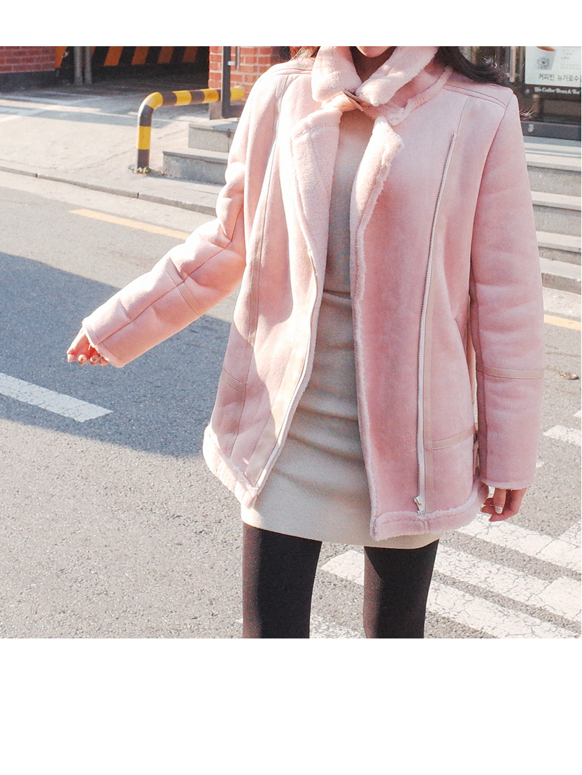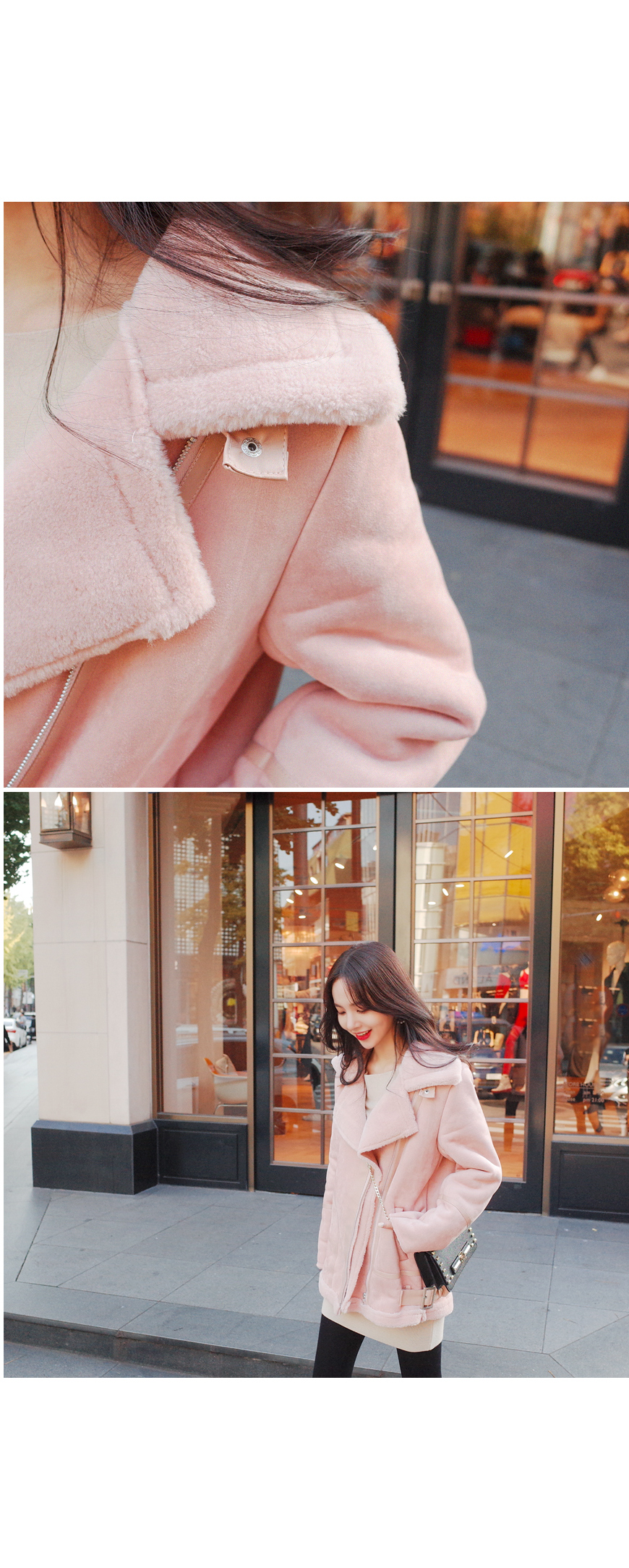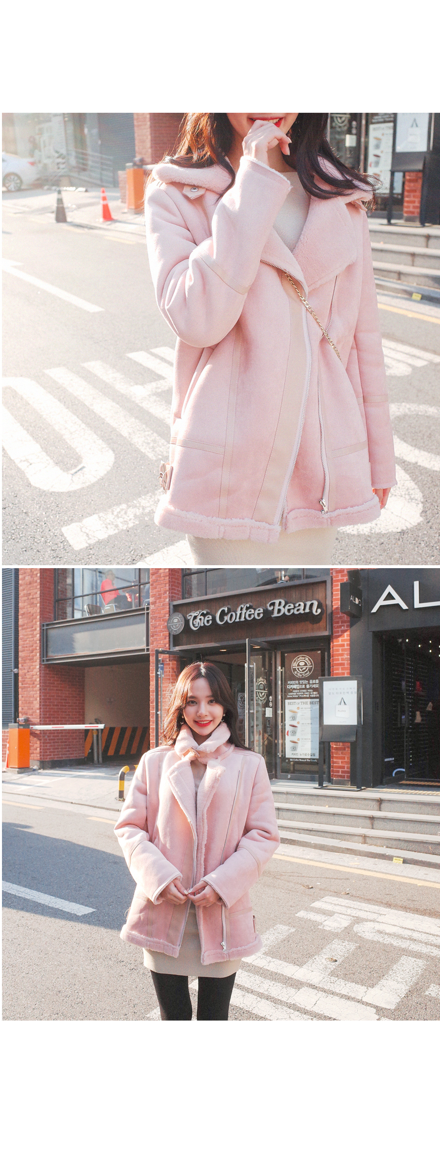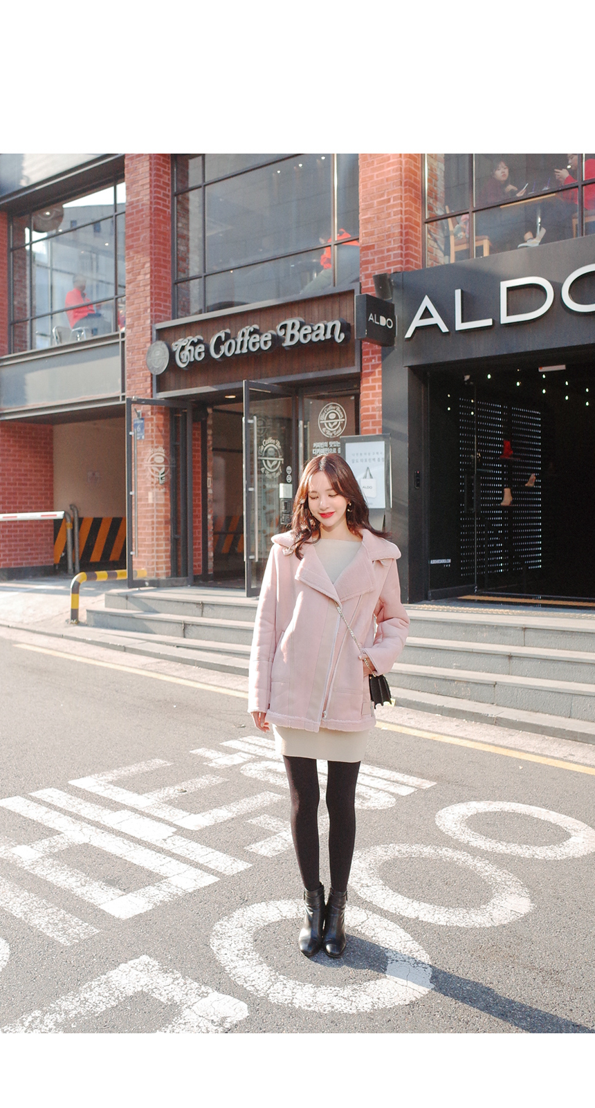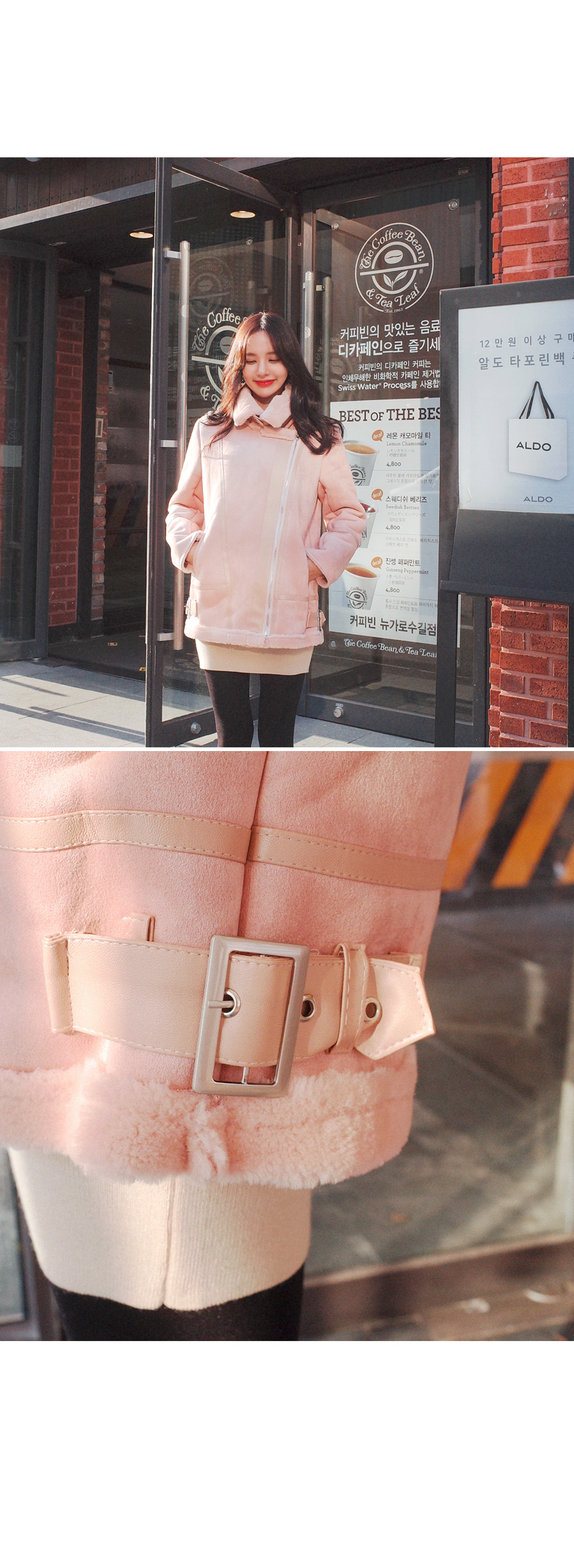 달달한 핑크컬러로 여성스러운 매력이 돋보이는 무스탕이에요