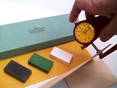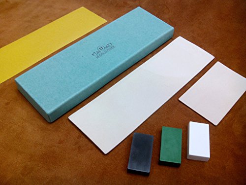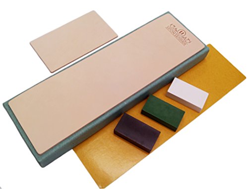 ◙ INCLUDES: We provide 1 double-sided tape FOR TROUBLE FREE operation for the larger piece, easily adhere this strop to a piece of wood, plexiglass, board, kitchen table or whatever. Avoid troubles with glue! Strops come in suede and smooth options, apply compound to one side for the first polishing step and use the other side for the final stropping touch. Polish your edges in 3 Steps. Everything inside a beautiful and sturdy gift box as shown.100% hand finished leather embossed with our logo.