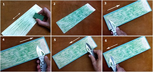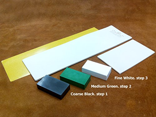 ◙ EASY TO USE: Stropping is the act of aligning the fine edge of a straight razor, woodworking chisels, hunting knives, fillet knives, pocket knives, kitchen knives, tactical knives, etc. Our Leather Strops GIVE & MAINTAIN a highly polished sharp cutting edge. Sequence: (Step 1) Abrasive Black, (Step 2) Medium Green and (Step 3) Fine White. Compounds weigh more or less 1 oz each and come in transparent plastic bags hermetically sealed and labeled with conservation instructions & sequence of use.