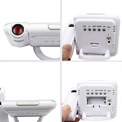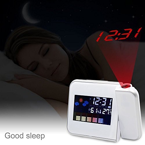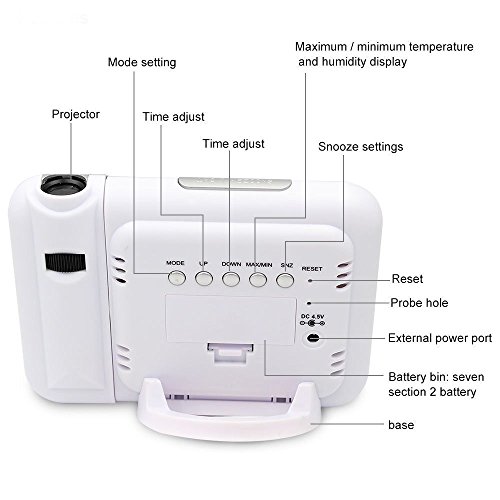Studio : Aphaca Direct Publisher : Aphaca Direct Binding : Kitchen Product Description This projection clock can manual 180-degree swivel projection has a full color screen that displays time, temp, humidity and projects the time onto any wall or ceiling,it also has alarm/snooze function. 1.Calendar Range: 2000-2099 2.Temperature Range: -10 ~ 61C ( 14.2 ~ 140F ) 3.Humidity Range: 20%~99% 4.12-hour temperature trend curve 5.Four-level weather forecast: sunny, half-sunny, cloudy, rainy 6.Query the history of MAX and MIN, update the temperature and humidity automatically. 7.Projection distance: about 1-5 meters 8.Font height: about 20-60cm 9.Projection rotation angle: 180 degrees 10Product size: high is 11cm ,wide is 15cm. Product Power: A program (with 3 AAA batteries) The projector screen will disappear after 8 seconds(Power saving settings), if you want to see the time and then click on the top of the "LIGHT" button. B program (with USB charging cable ) AC transformer power supply, the projection and the screen is always bright (no close function), you can see LED backlight and projection all the time. Note:The alarm needs to be reset the time after power outage, 12 Hour and 24 Hours can switch display. Package List: 1x Projection Clock 1x USB Charging Cable 1x Instructions Note: Open alarm clock function, please have a try to press UP button. If you have any problems about the clock or setting, please do not hesitate to contact us.