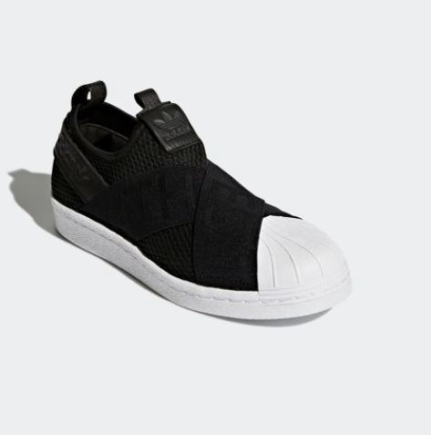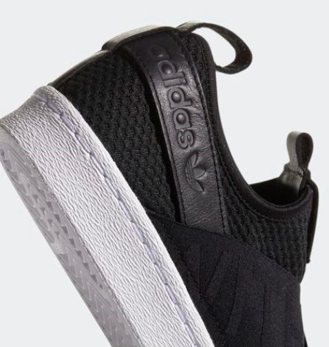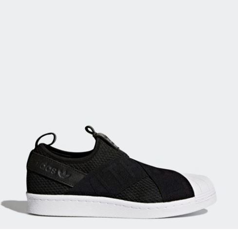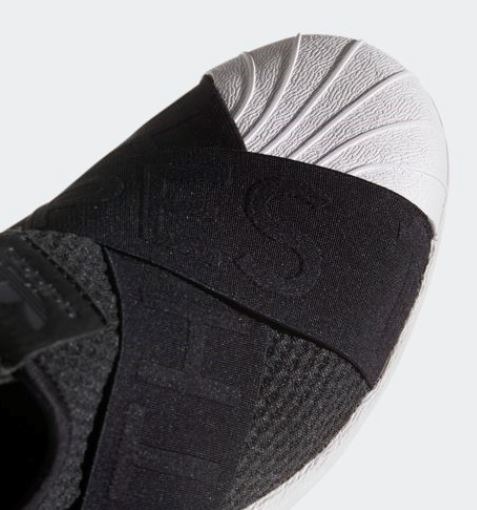 슬립온 디자인의 쉘토 아디다스 슈퍼스타메쉬 갑피, “The brand with the 3-Stripes” 텍스트 그래픽이 적용된 탄력적인 엔지니어드 스트랩클래식 러버 쉘토편안한 착용감의 항균 방취 기능 오쏘라이트(OrthoLite®) 삭라이너; 저지 삭라이너 커버측면과 설포의 디보싱 로고쿼터 오버레이의 트레포일 로고고무 아웃솔