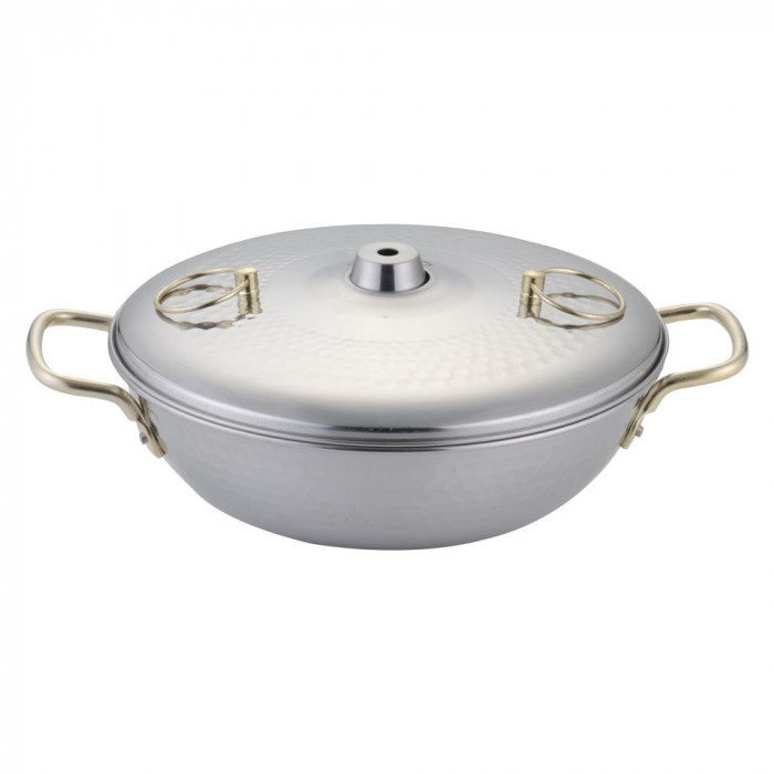 fk094igrjs高級感のある鍋でしゃぶしゃぶができます サイズ A:334m/m、B:260m/m、C:72m/m、D:116m/m 個装サイズ:26.5×30×12cm 重量 755g 個装重量:950g 素材・材質 本体/ステンレス(0.7m/m) フタ/ステンレス ハンドル/鉄、金色メッキ リング/真鍮、真鍮メッキ 仕様 食器洗浄機:不可 対応熱源:ガス火 容量:2.3L 付属品 取扱説明書 生産国 日本 ガス火専用のしゃぶしゃぶ鍋 高級感のある鍋でしゃぶしゃぶができます