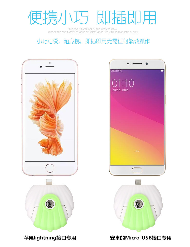 The World First cell phone beauty mist spray diffuser, which have 2 interface options: Apple lightning and Android micro-USB. PLEASE DOUBLE CONFIRM the interface before placed order.