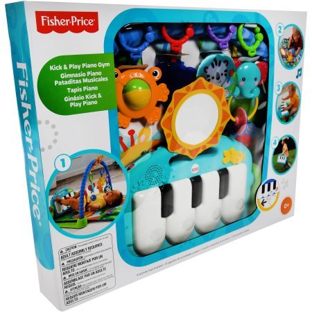 -. Feature : Four ways to play! / Lay & play; Tummy time; Sit & play; Take-along / Music rewards baby as she kicks the piano keys 5 busy activity toys & a large mirror / Toys include a hippo teether, elephant clackers, rollerball frog & more! / Short or long-play music-up to 15 minutes