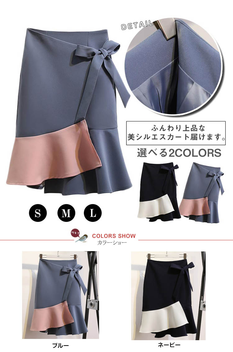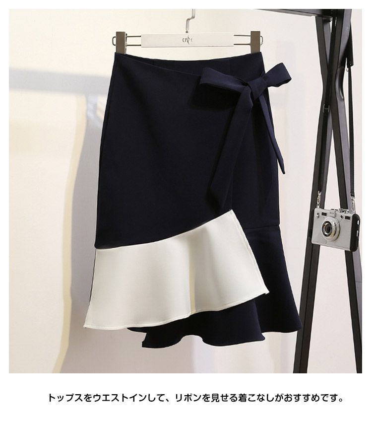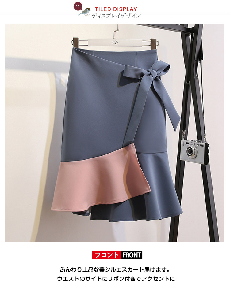 | ふんわり上品な美シルエスカート届けます。ウエストのサイドにリボン付きでアクセントに裾部分のバイカラー切り替えになってインパクトも抜群。程度よく広がってとってもキレイなシルエットを演出してくれます。トップスをウエストインして、リボンを見せる着こなしがおすすめです。 | |