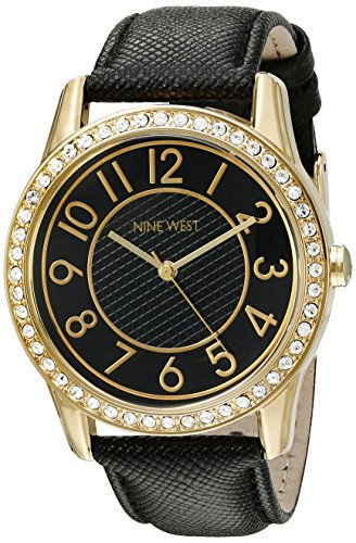 -. Title : Nine West Women's NW/1730BKBK Easy To Read Swarovski Crystal Accented Gold-Tone and Black Leather Strap Watch