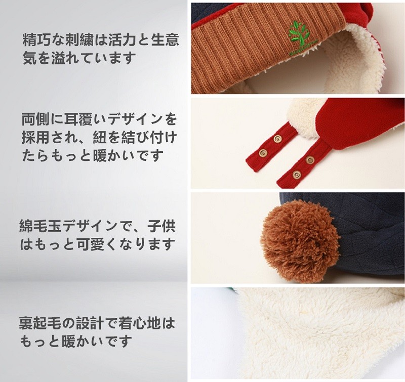 「生地」柔軟なポリエステルを採用し、無毒、無公害、柔らかい生地、心地よいフィット感と長持ち。(頭がすこし大きい赤ちゃんに適合できないので、ご注意ください)(M:頭のサイズ 48-52cm L:頭のサイズ 52-56cm)。「耳保護」暖かいイヤーフラップの設計では、耳をちゃんと保護してくれた、優れた保温性があります。「マスクとマフラー付き」帽子のロープを飾りとしてでも、帽子を繋ぎているしっかりに固定します。また、 同じ材質取り外れるマスクとマフラーも付きから、頬、口鼻及び首部分も寒さからしっかりガードできます。「優れたデザイン」帽子の周り部分に弾性輪ゴムのデザインがあり、伸縮力があり、頭部にフィットし、束縛な感じがない、かぶり心地が良い、保温性に優れ、寒い季節には最適。